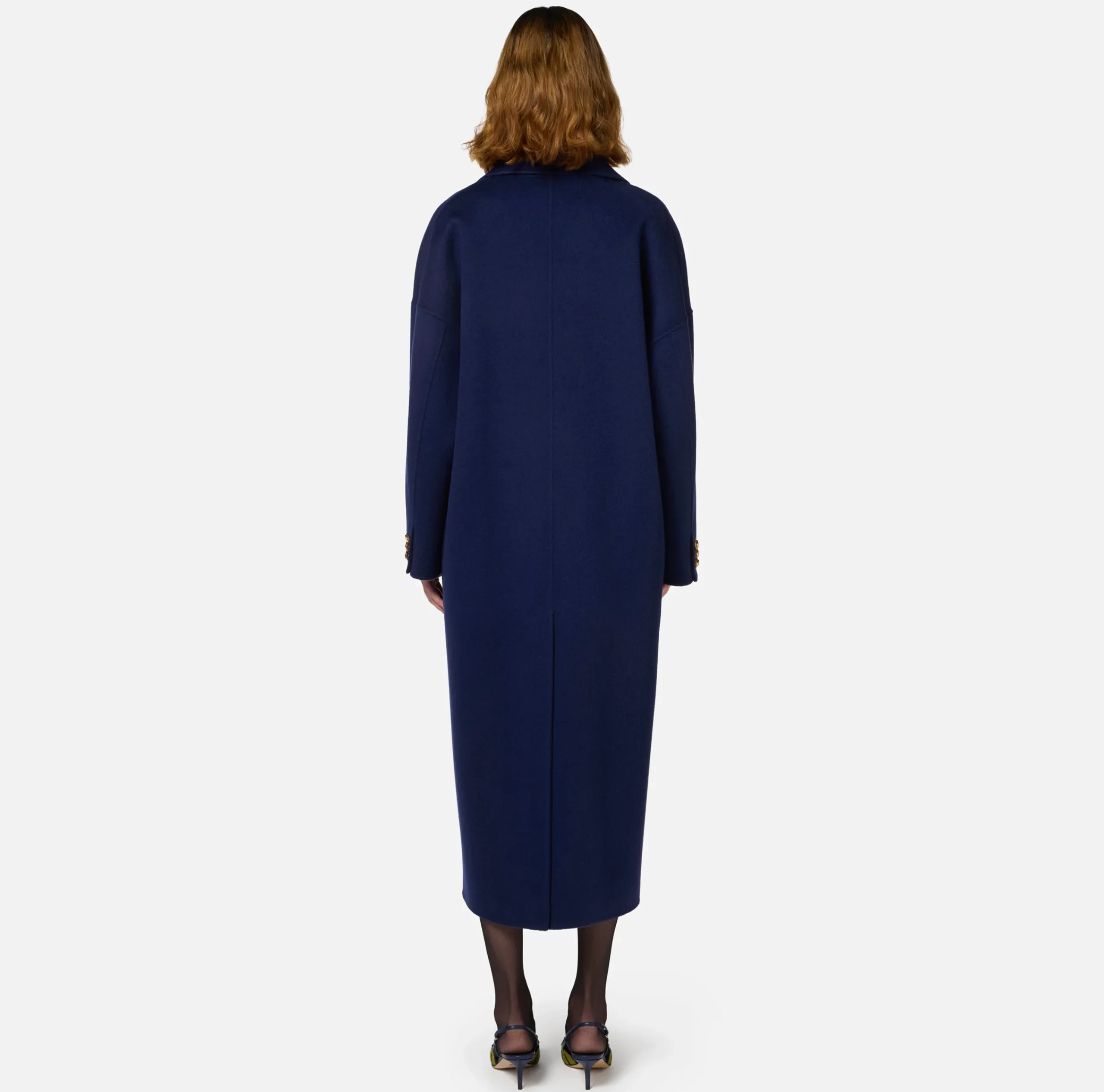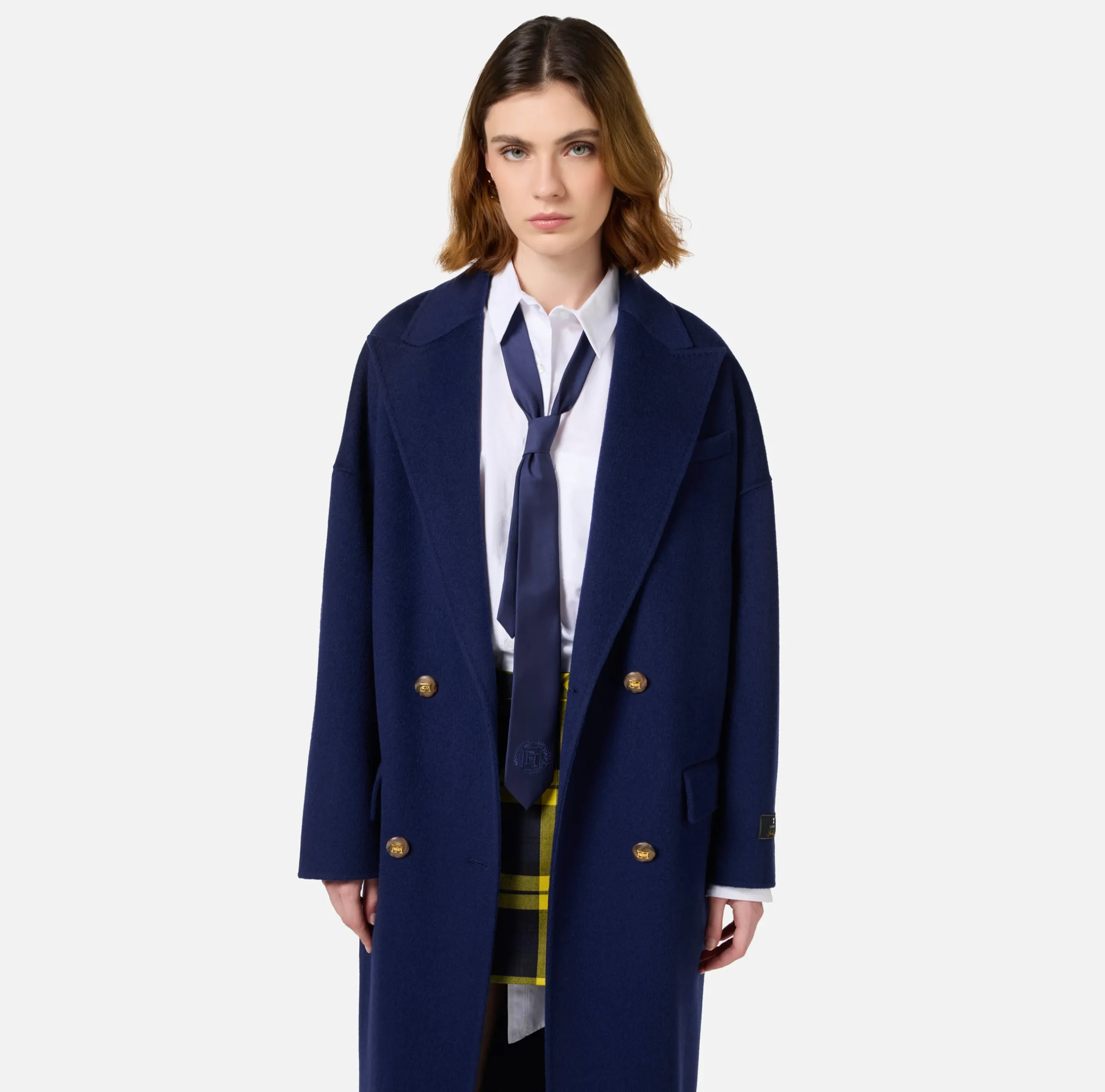 Cappotto over in pura lana con chiusura doppiopetto con bottoni effetto corno. È caratterizzato da revers a lancia, tasche frontali a pattina e filetto e etichetta di collezione cucita sulla manica.