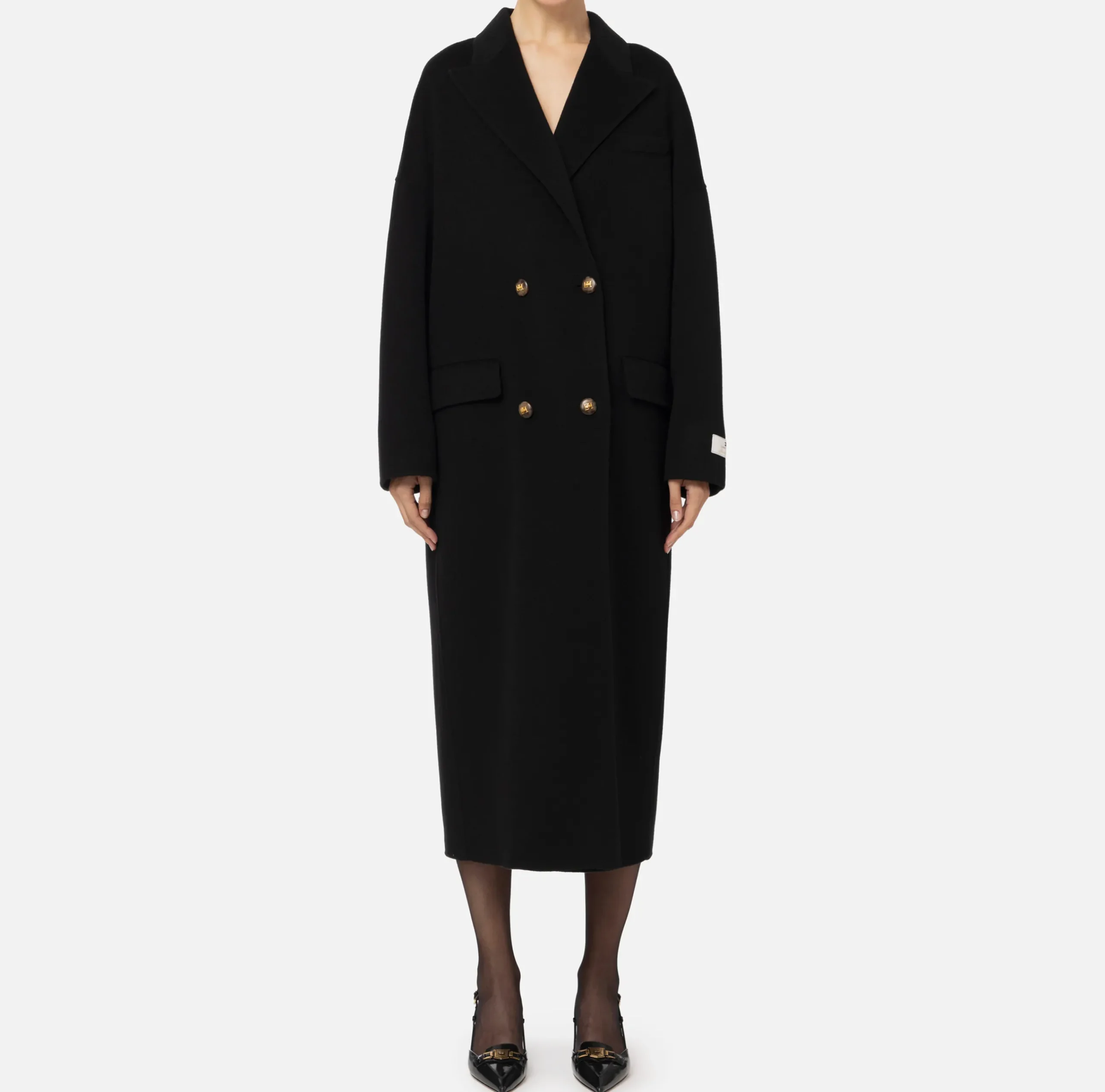 Cappotto over in pura lana con chiusura doppiopetto con bottoni effetto corno. È caratterizzato da revers a lancia, tasche frontali a pattina e filetto e etichetta di collezione cucita sulla manica.