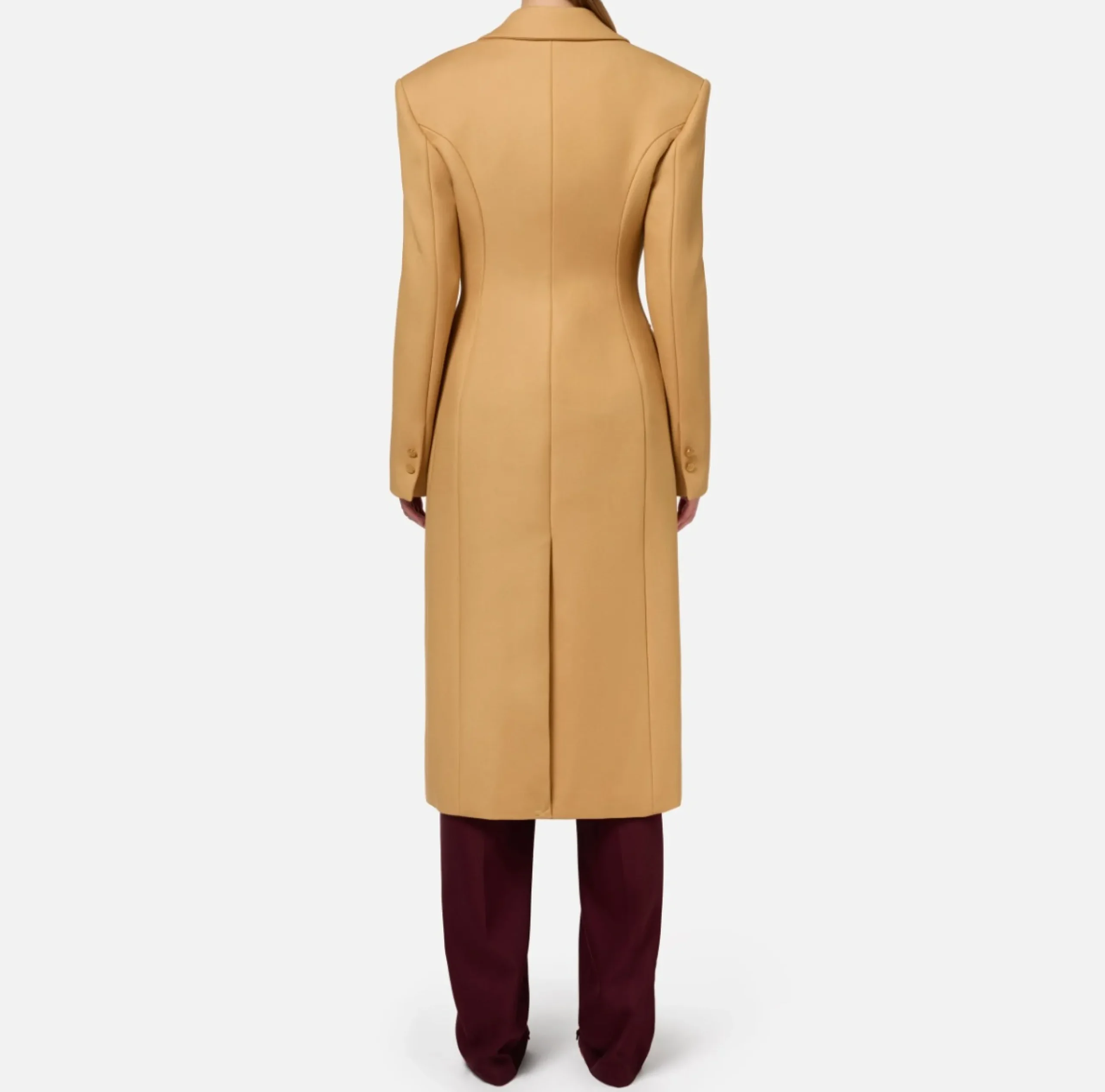 Cappotto in crêpe pesante con chiusura monopetto e tasche frontali a pattina. È caratterizzato da revers a lancia, spalle strutturate e sfiancatura al punto vita.