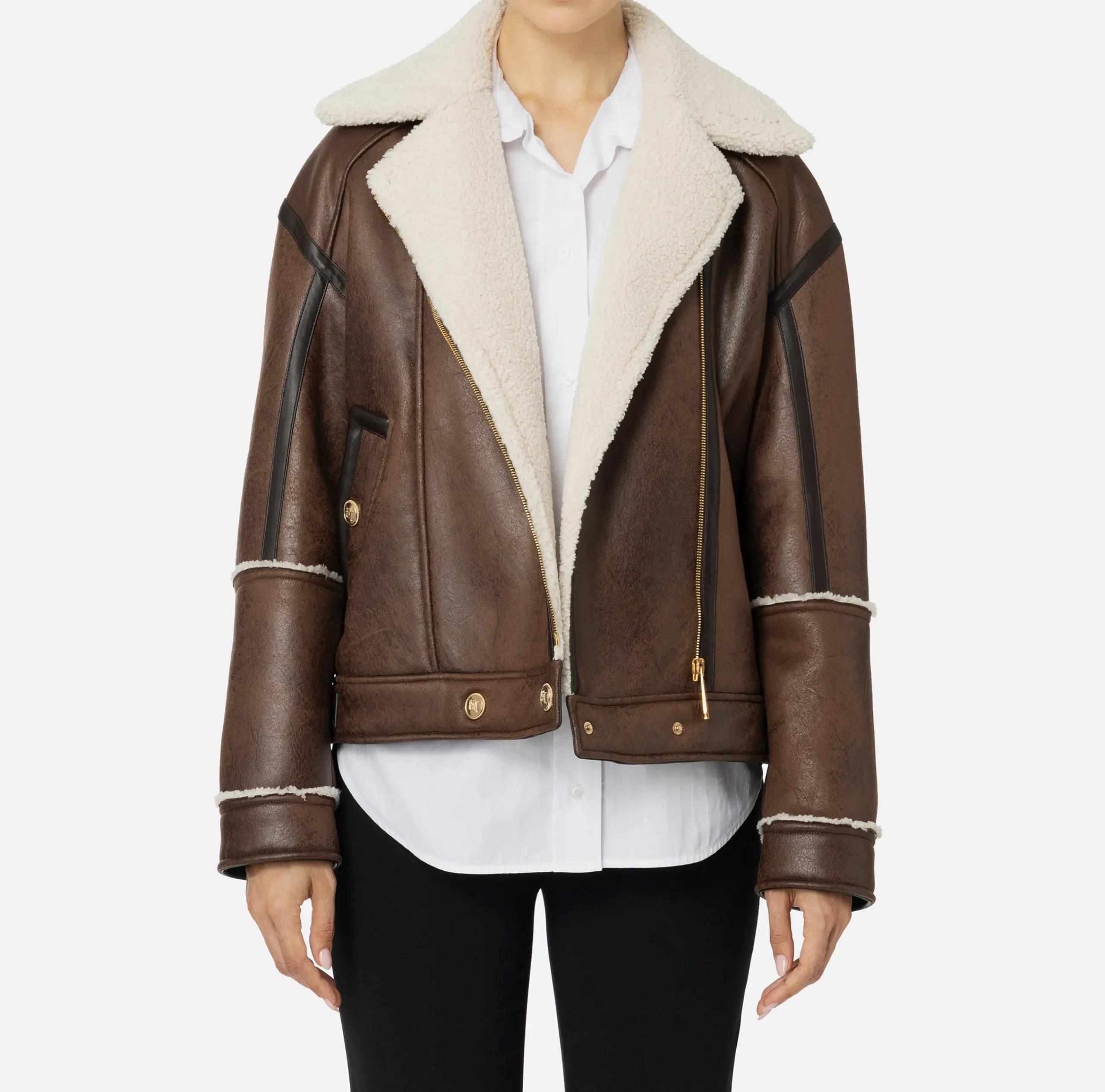 Giacca aviatore in materiale sintetico effetto pelle con collo a contrasto. È caratterizzato da chiusura laterale con zip, bottoni in metallo dorato su polsini e orlo e etichetta logo sul carré dietro.