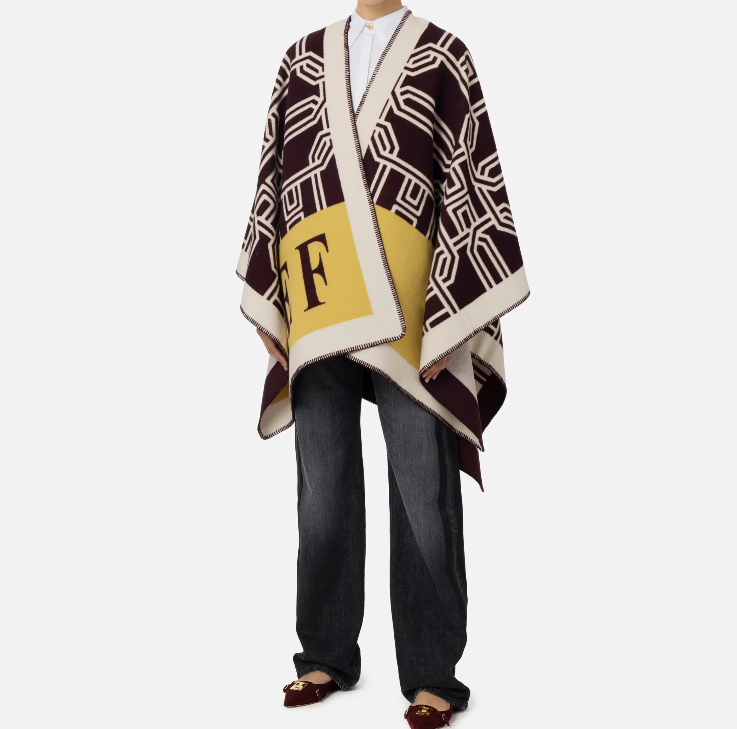 Capispalla|Elisabetta Franchi Mantella in lana jacquard con lettering RougeNoir/Mimosa