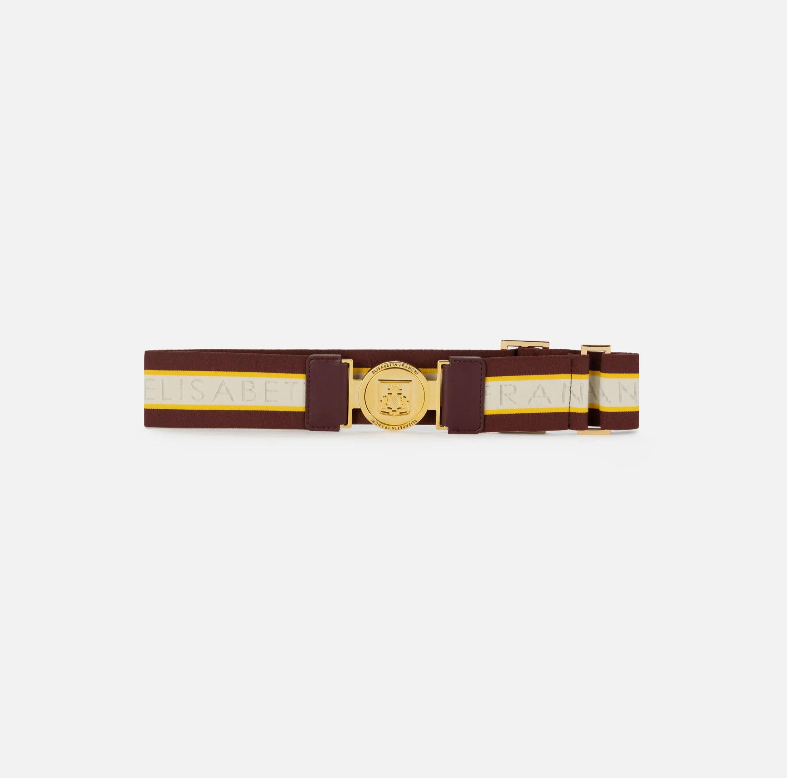 Cintura in elastico logato a tre colori con fibbia logo in metallo dorato e chiusura a incastro.