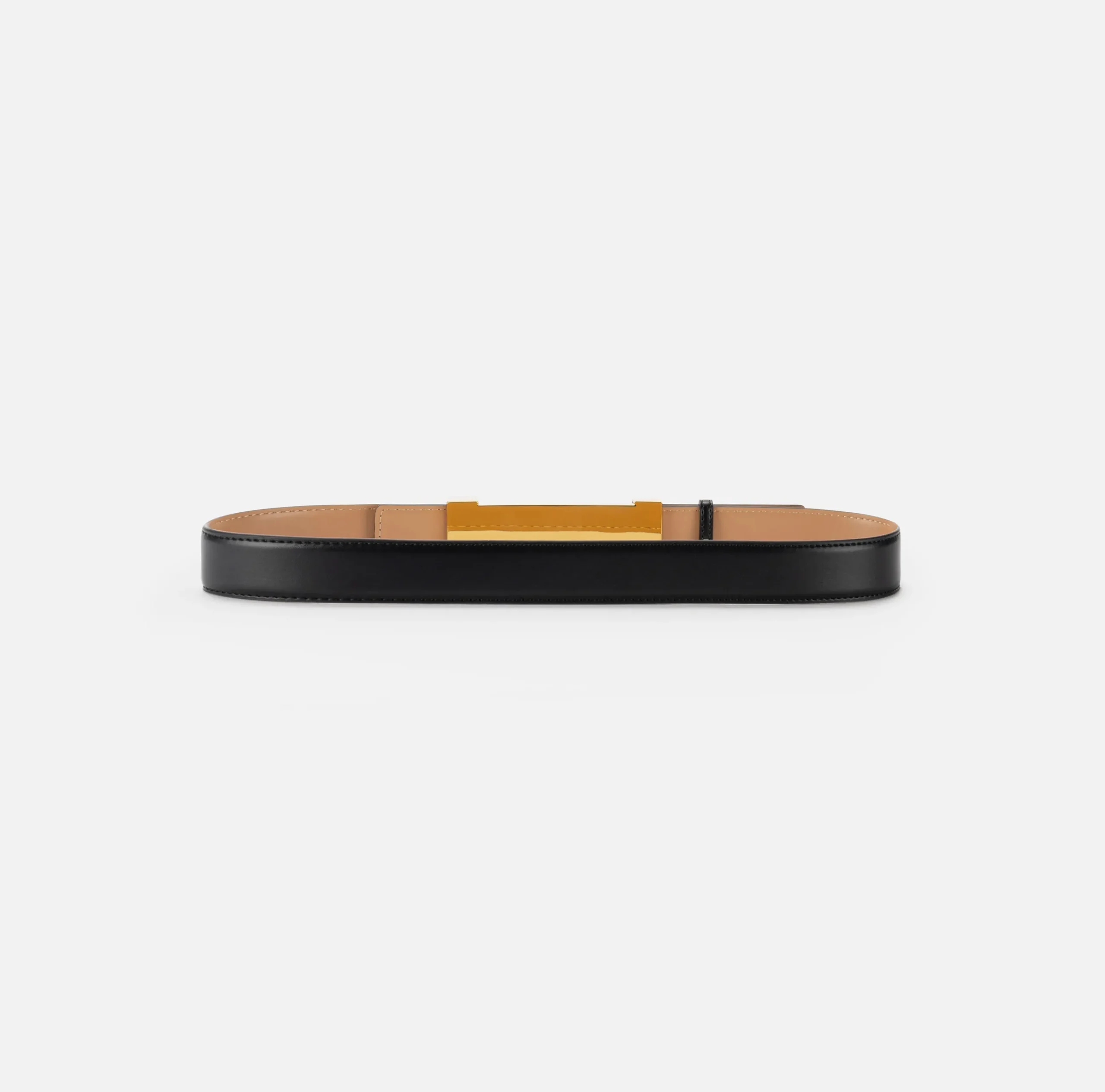 Cintura in materiale sintetico effetto pelle con fibbia a perno in metallo dorato. È caratterizzata da due passanti logo in metallo dorato.