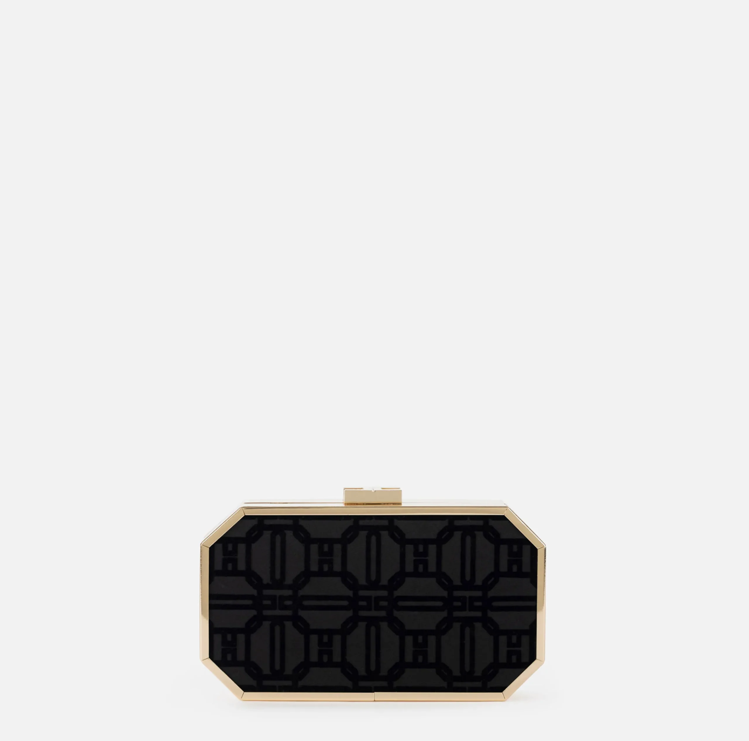Clutch ottagonale in metallo dorato e tessuto flock. È caratterizzata da chiusura a girello in metallo dorato.