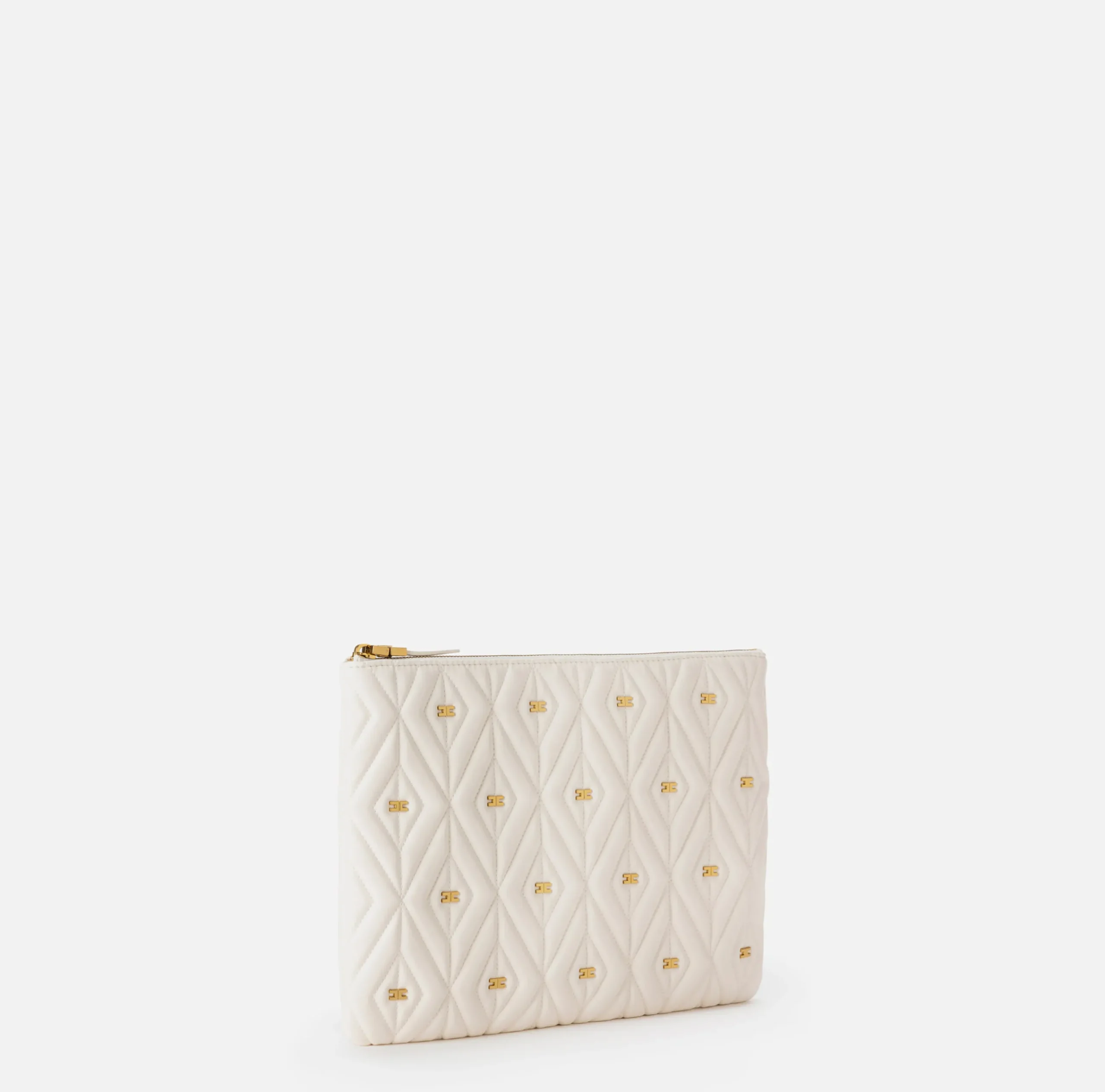 Pochette in materiale sintetico effetto pelle. Superficie trapuntata e imbottita con rivetti logati in metallo dorato vintage. È caratterizzata da tirazip logato.