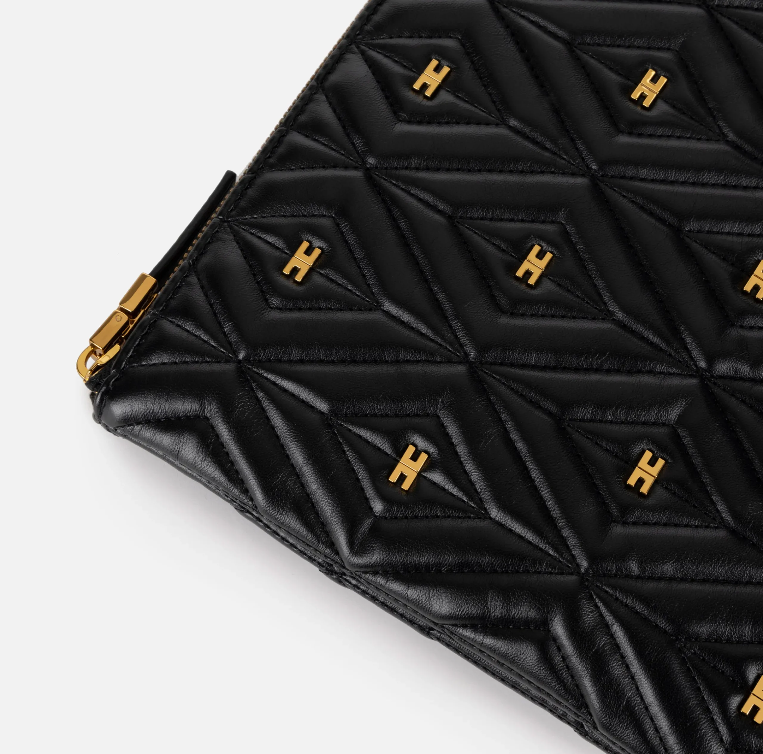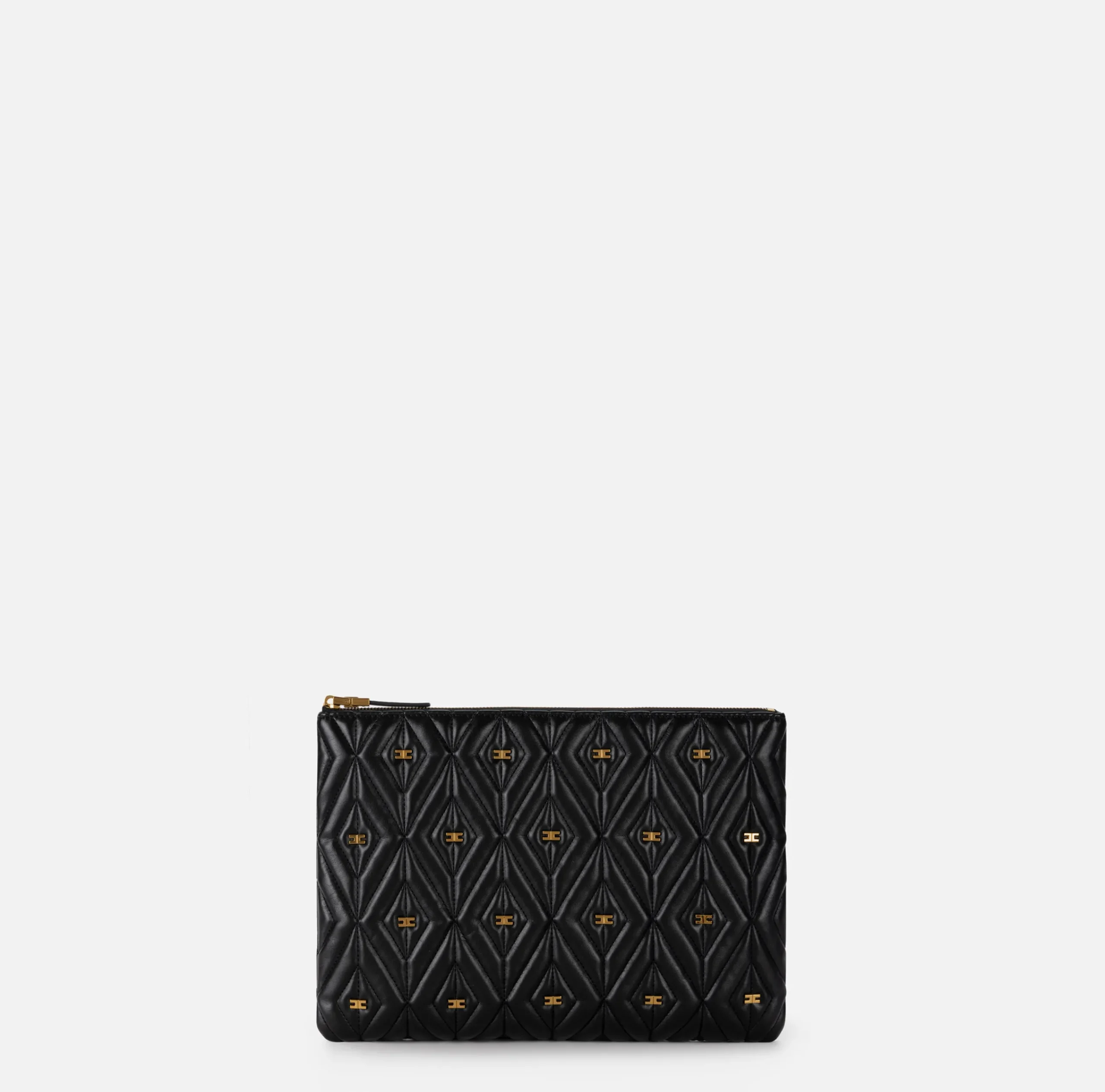 Pochette in materiale sintetico effetto pelle. Superficie trapuntata e imbottita con rivetti logati in metallo dorato vintage. È caratterizzata da tirazip logato.
