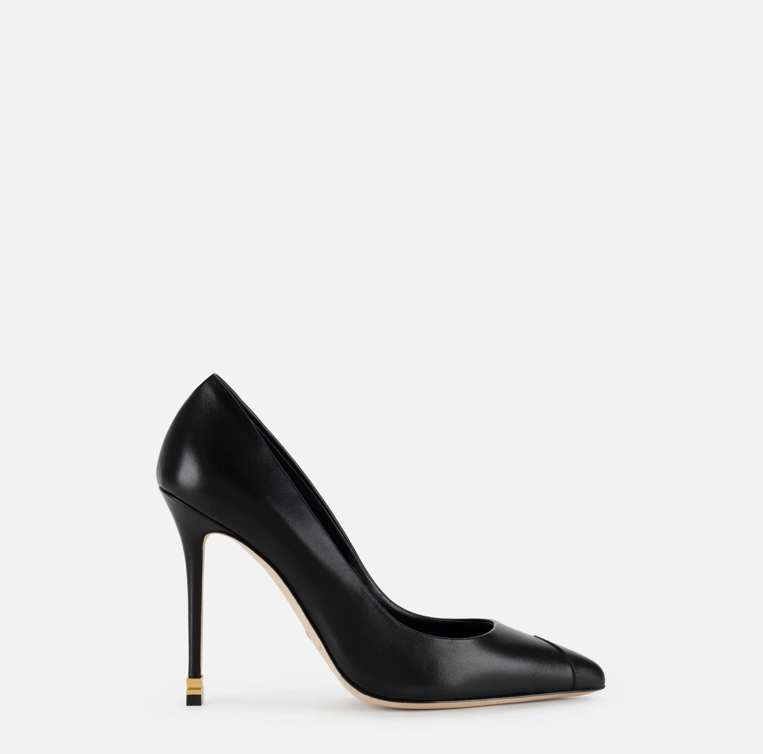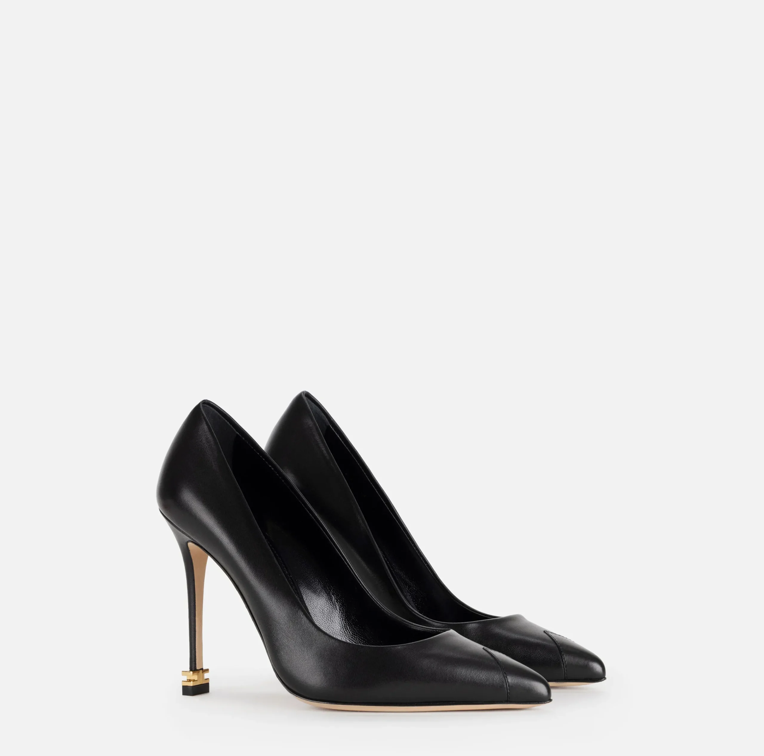Décolleté in nappa su tacco a stiletto. È caratterizzata da logo in metallo dorato sulla base del tacco. La tomaia presenta un taglio a puntalino sul davanti.
