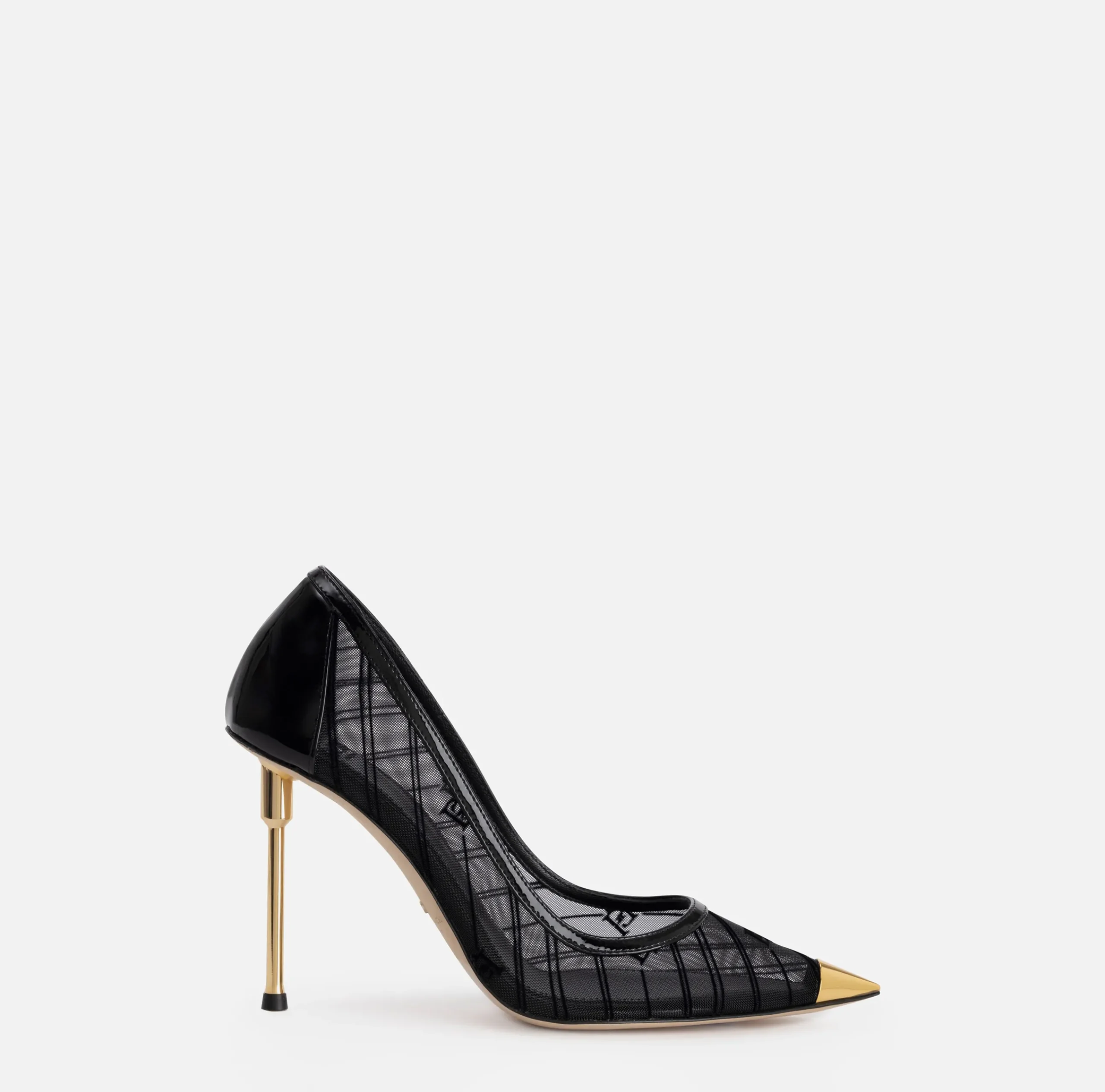 Décolleté in rete flock con puntalino e tacco scultura in metallo dorato.