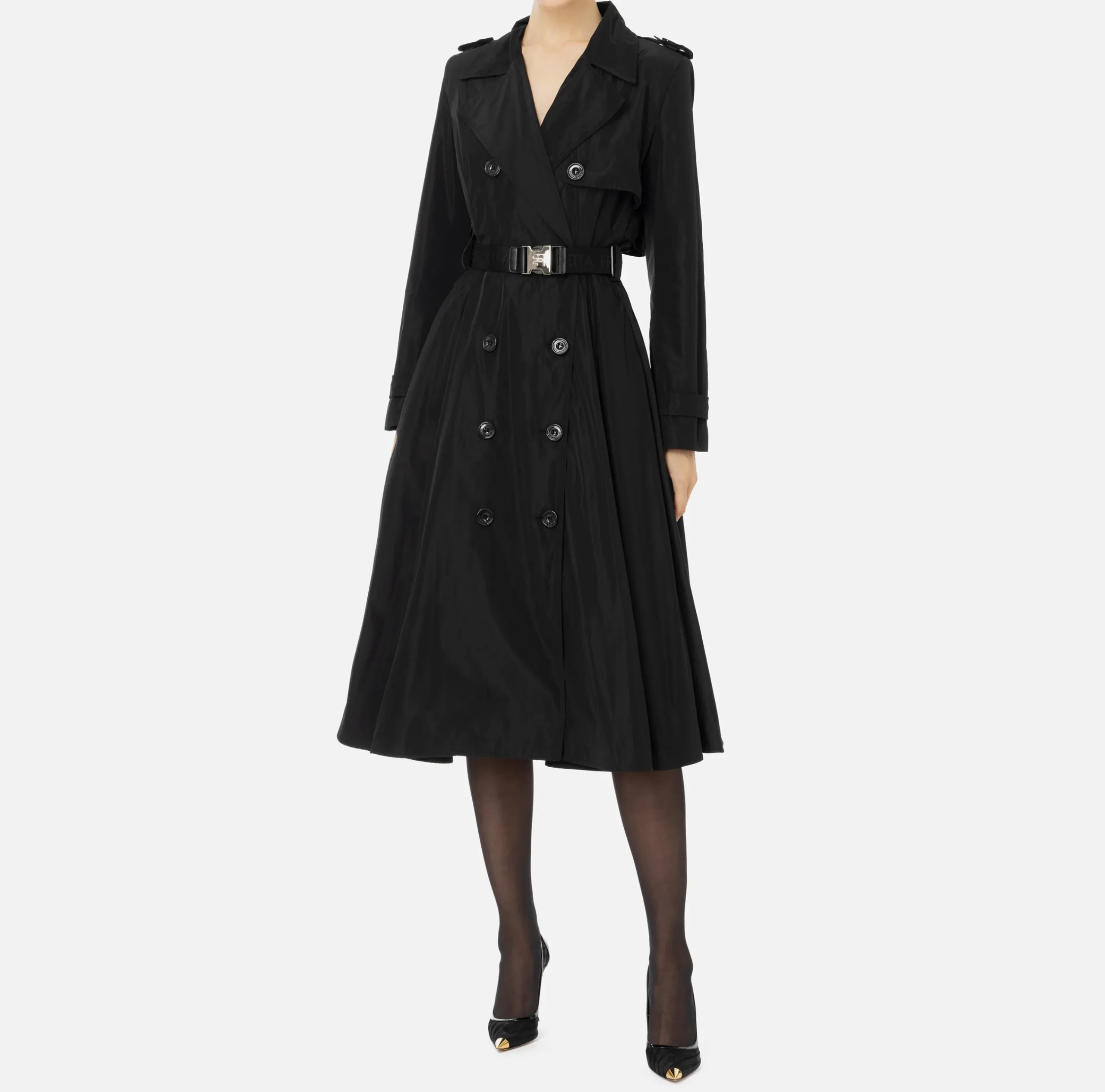 Trench doppiopetto in nylon con gonna a ruota a pieghe e stampa logo sul dietro. Il punto vita è enfatizzato da una cintura in elastico logato con fibbia in metallo verniciato.