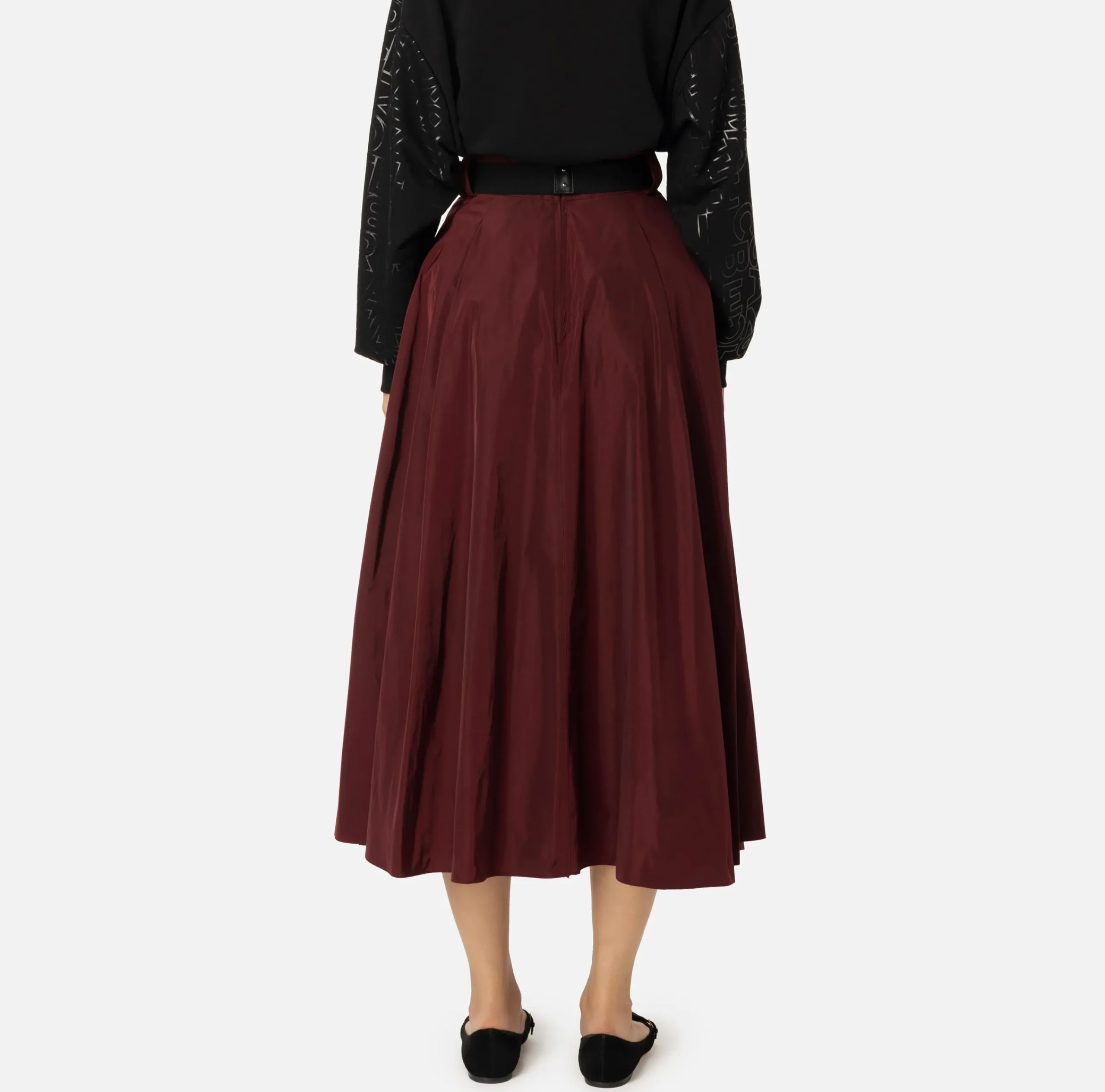 Gonna midi in nylon tecnico leggero ampia al fondo con tasche alla francese. Il punto vita è enfatizzato da una cintura con fibbia in metallo silver.