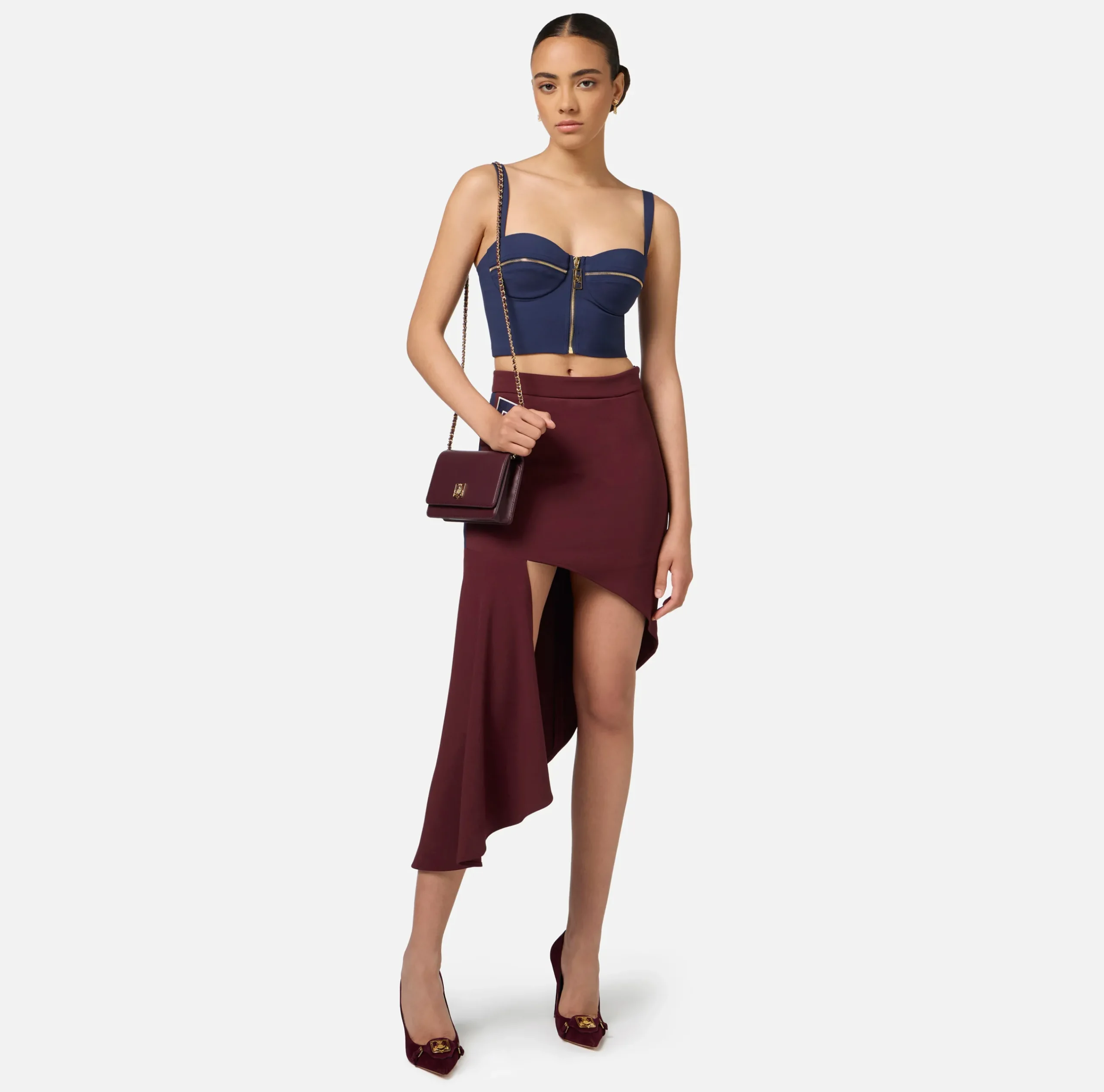 Be the first to review “Gonne|Elisabetta Franchi Gonna asimmetrica in crêpe stretch con bande e ricamo logo Oro” Annulla risposta