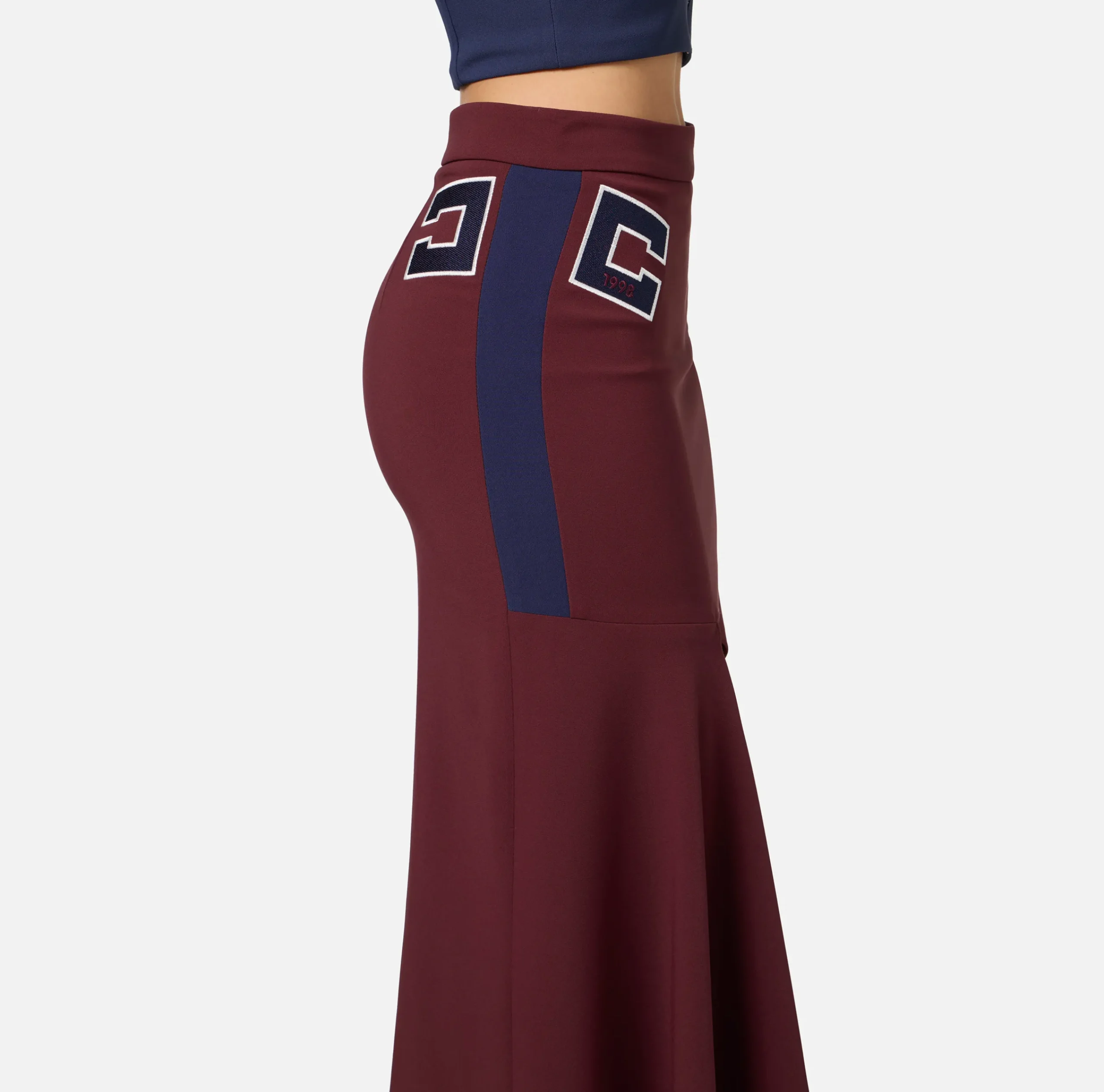 Gonna midi in crêpe stretch con fondo asimmetrico che crea un drappeggio. È caratterizzata da bande e ricamo logo sul fianco in contrasto colore.