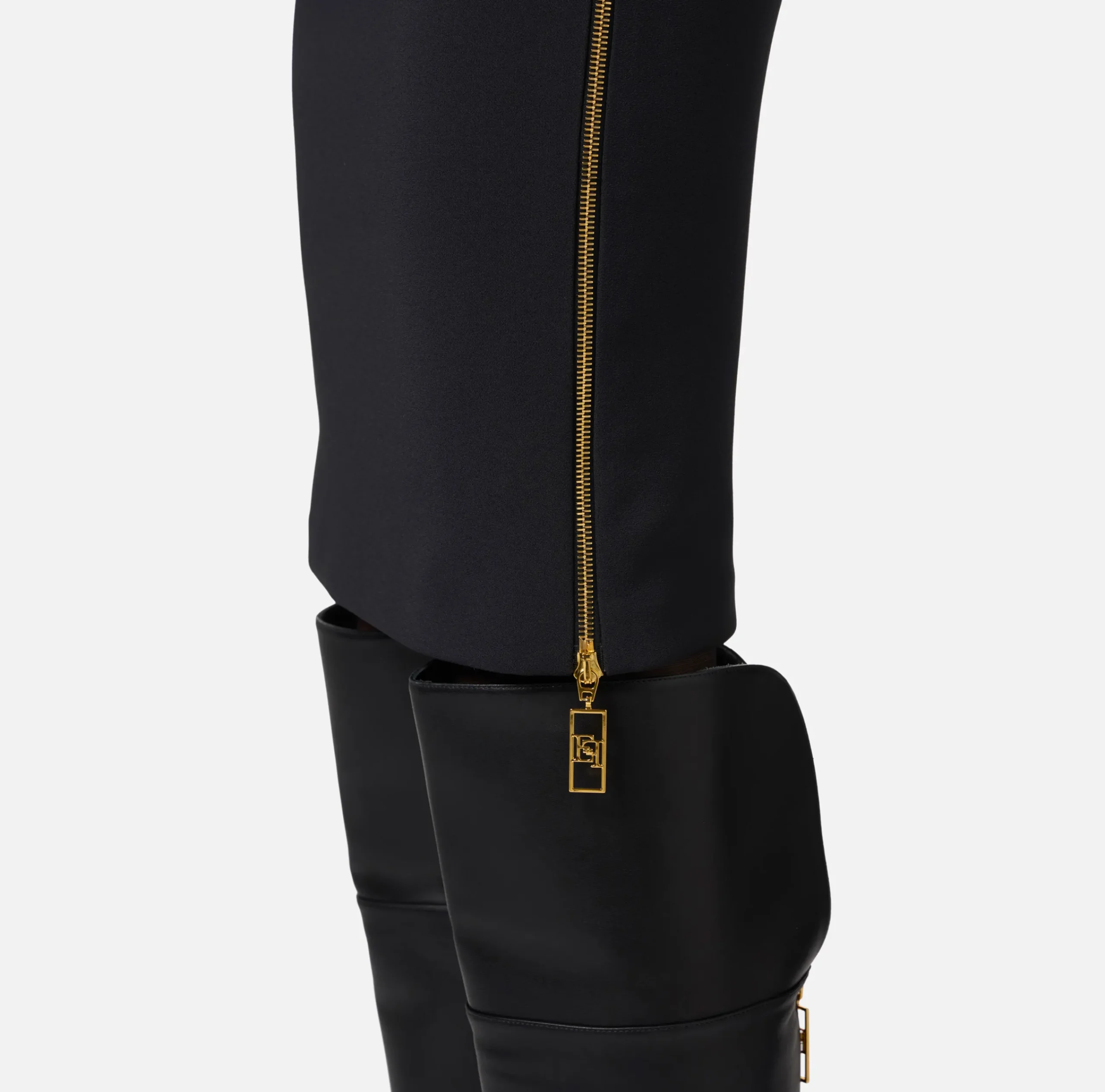 Gonna midi in doppio crêpe stretch. È caratterizzata da motivo di zip con tiretto logato che segue tutta la lunghezza dei fianchi.