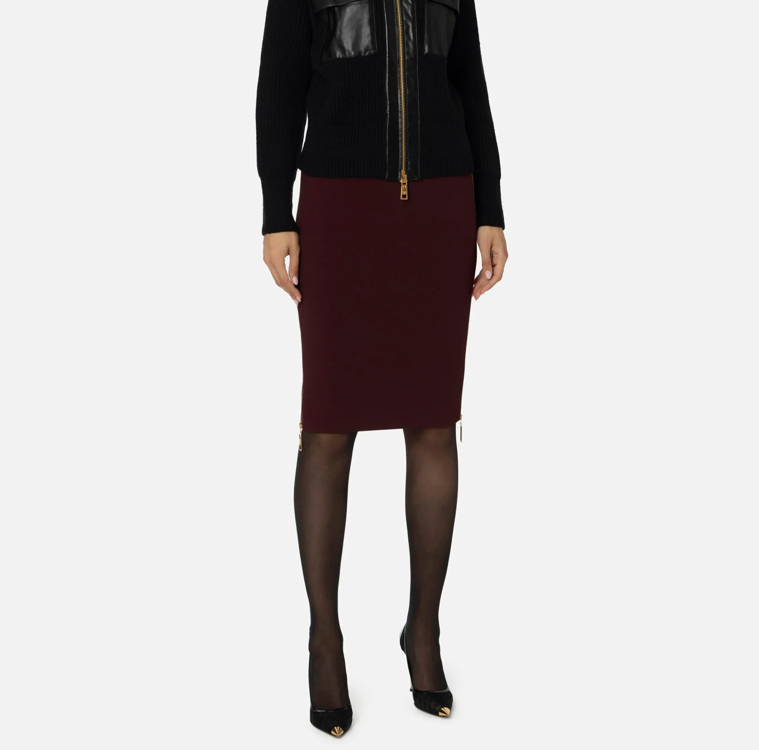 Gonna midi in doppio crêpe stretch. È caratterizzata da motivo di zip con tiretto logato che segue tutta la lunghezza dei fianchi.