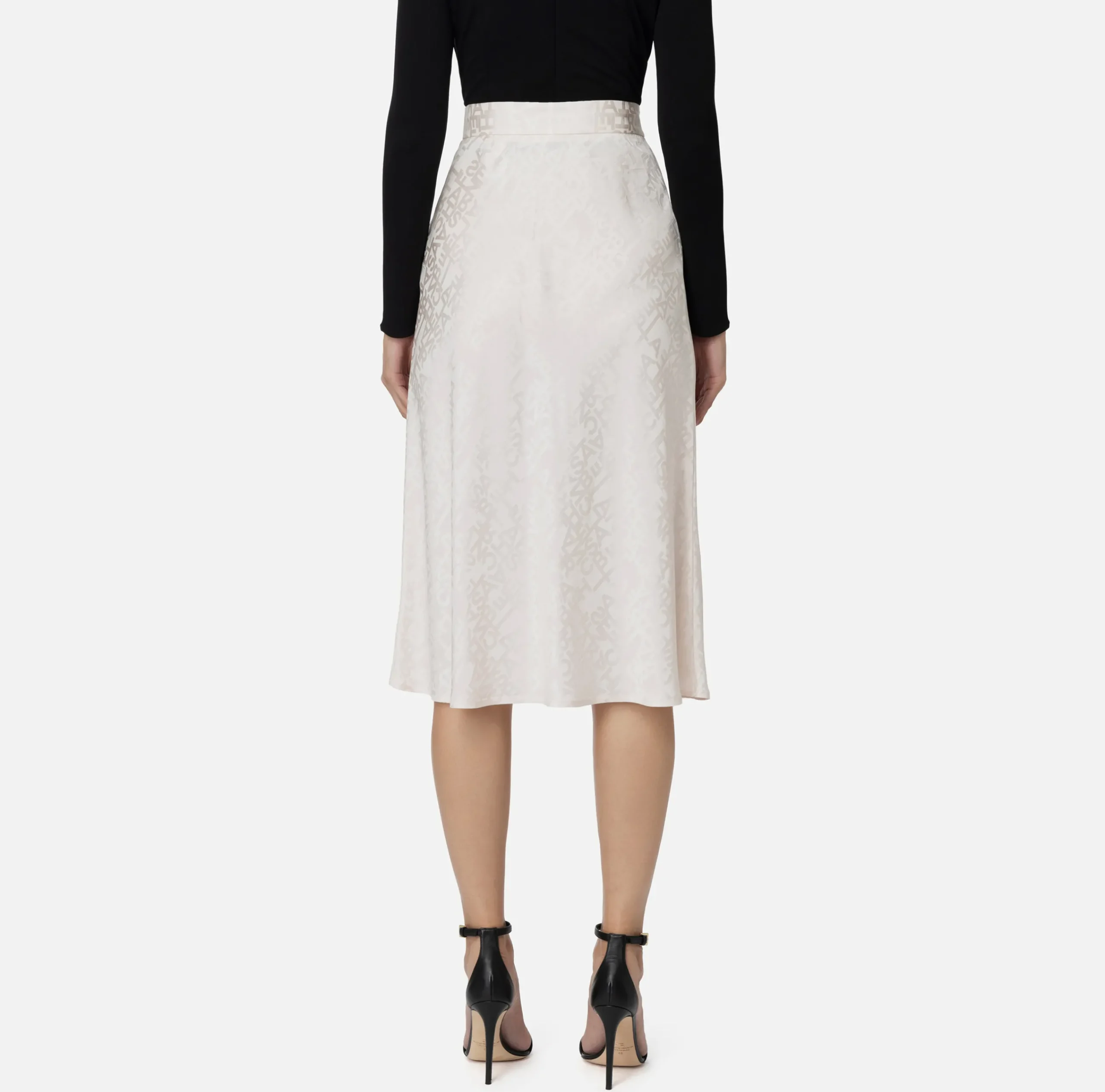 Gonna midi in crêpe jaquard lettering che svasa al fondo.