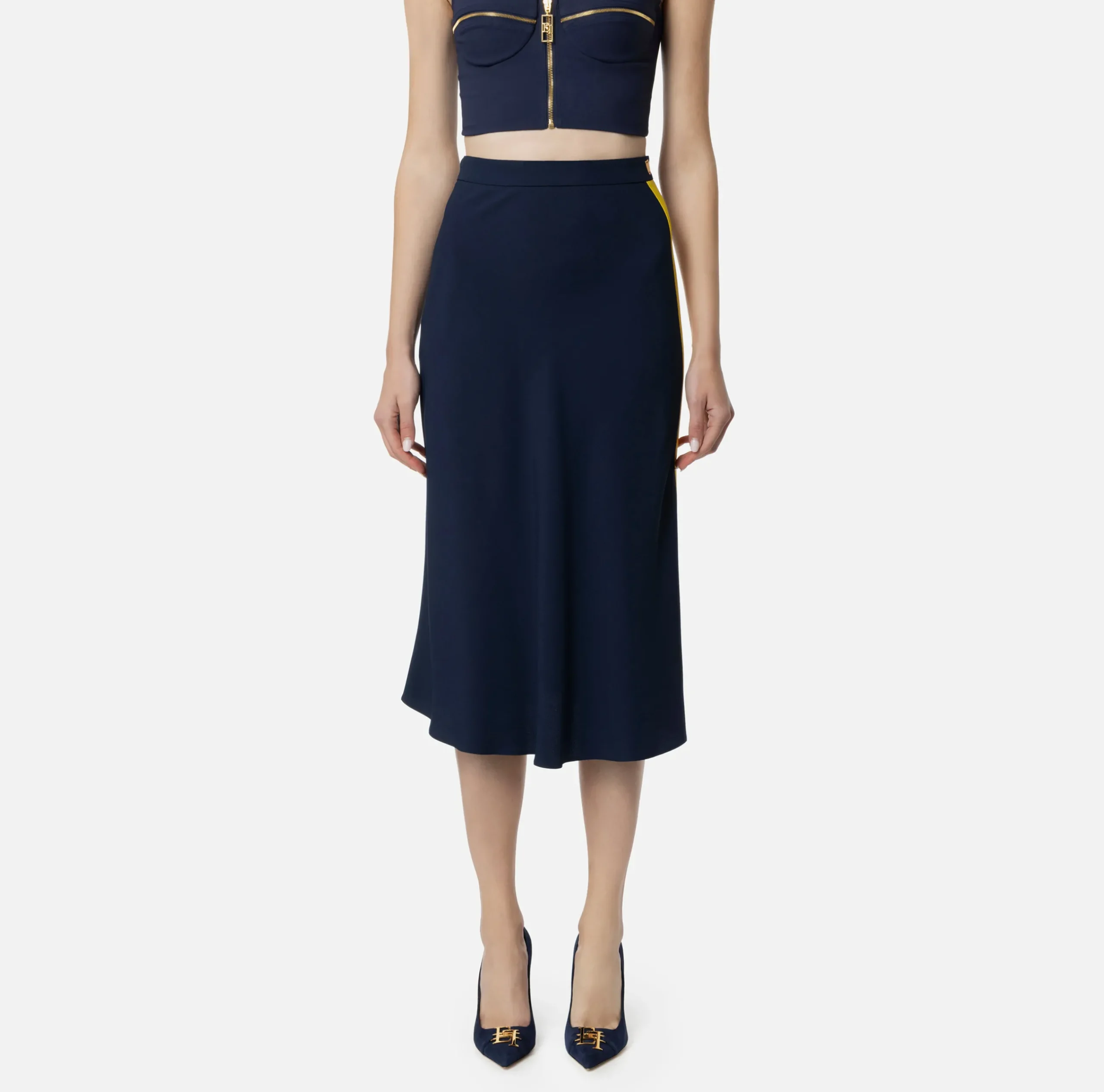 Gonne|Elisabetta Franchi Gonna midi in crêpe satin con bande Navy/Mimosa/Burro