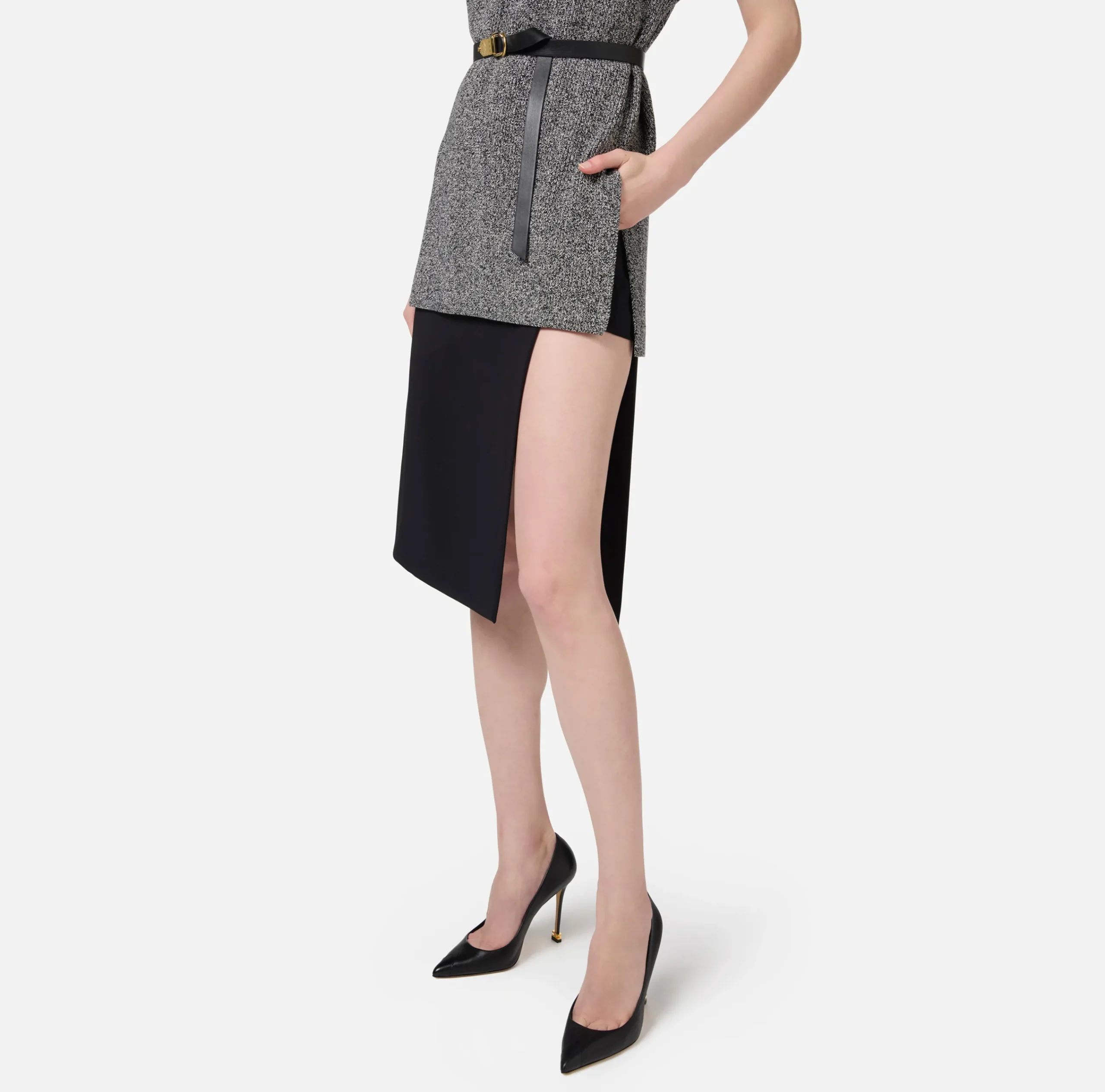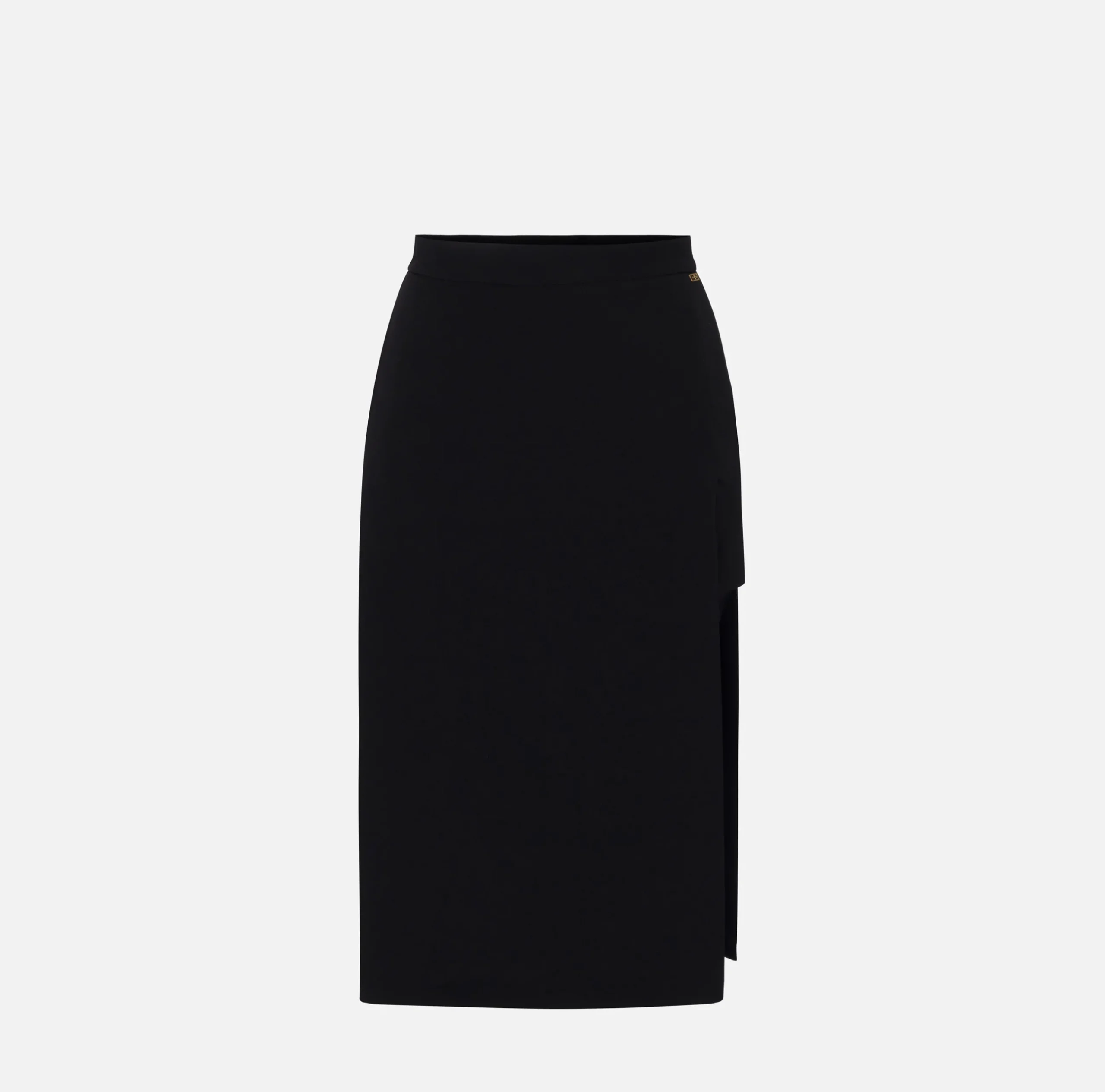 Gonna midi in crêpe stretch composta da due pannelli uniti tra loro grazie a uno shorts sottostante visibile ai fianchi. Il punto vita è enfatizzato da un fascione con placca laterale in metallo dorato.