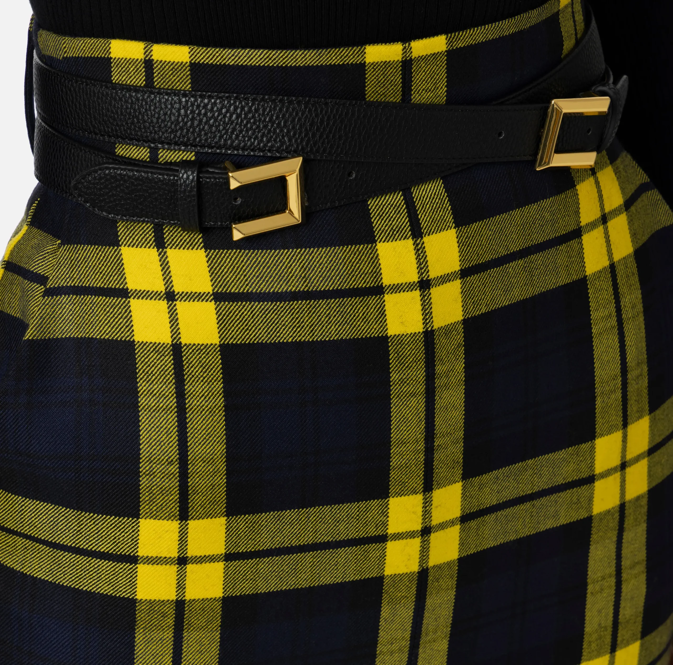Gonna midi in lana tartan con spacco nel centro davanti. Il punto vita è enfatizzato da cintura incrociata con doppia fibbia in metallo dorato.