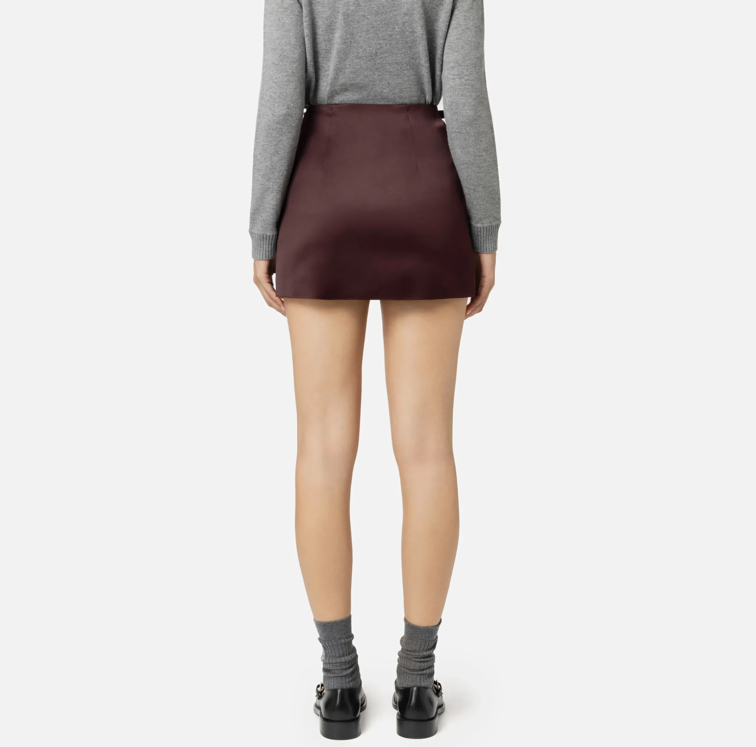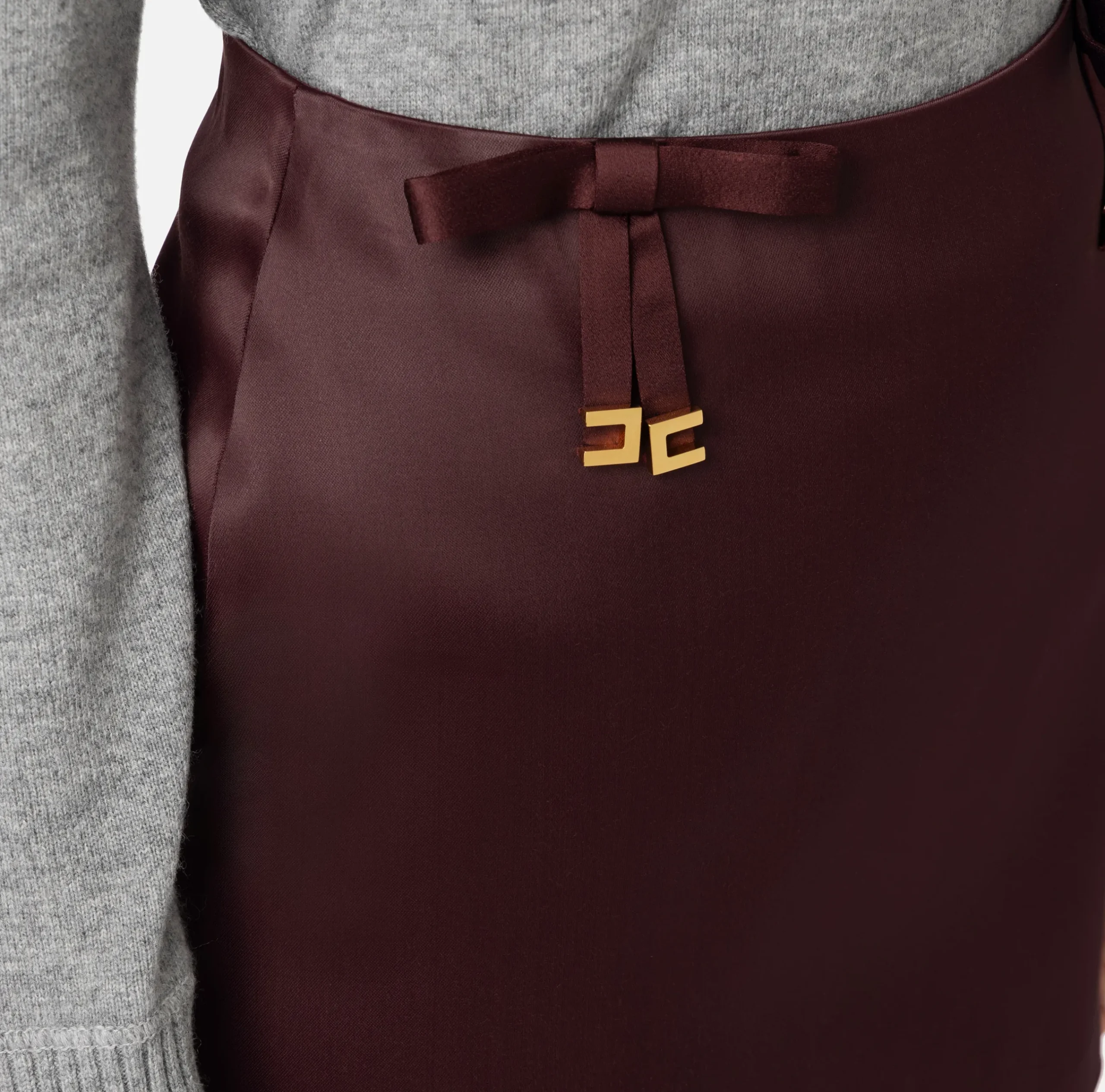 Minigonna in raso con fiocchi rifiniti da finalini in metallo dorato posizionati nei fianchi.