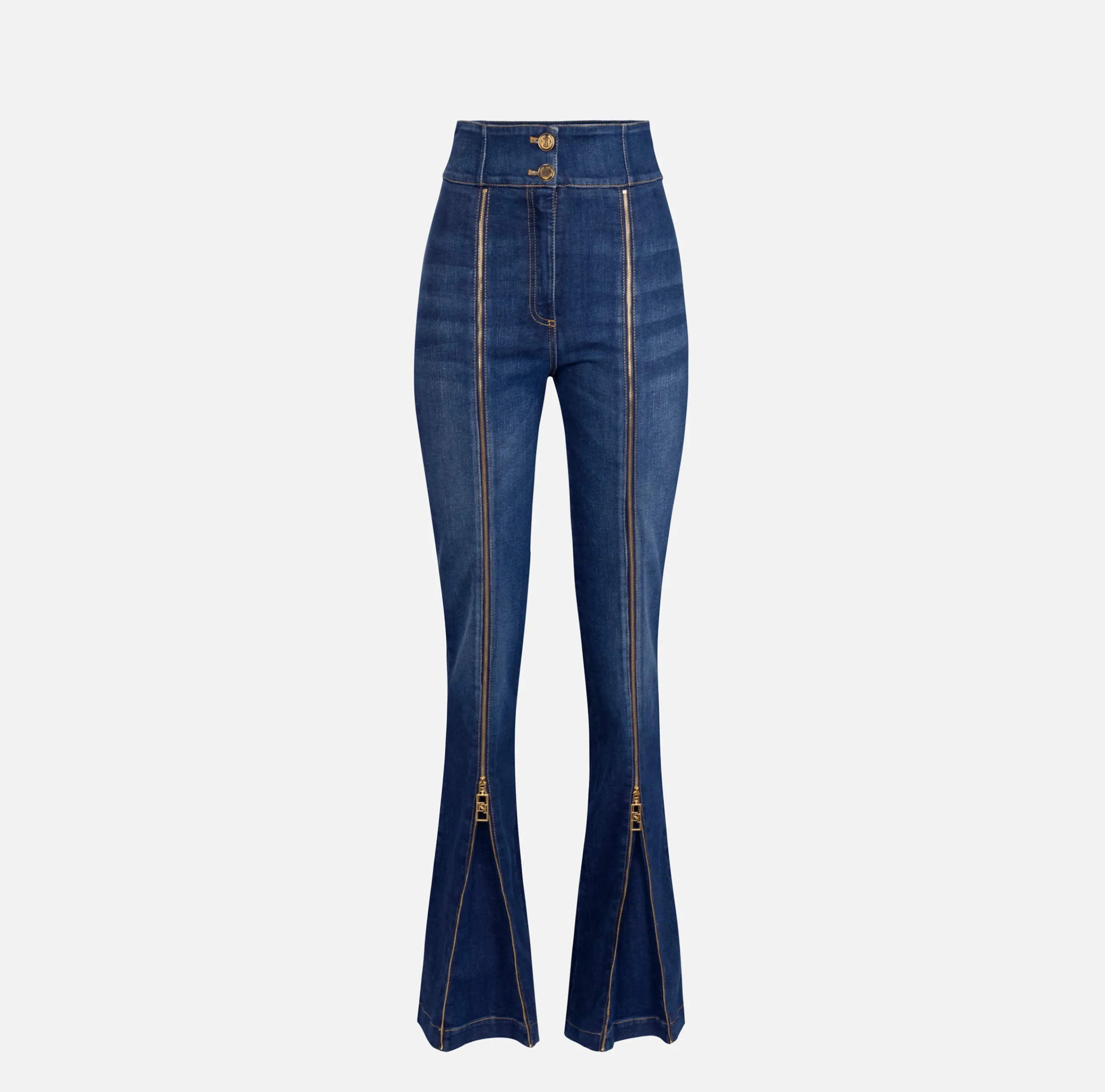 Jeans a zampa in cotone a vita alta. È caratterizzato da bottoniera frontale e doppia zip in metallo dorato con tiretto logato inserite sul fronte.