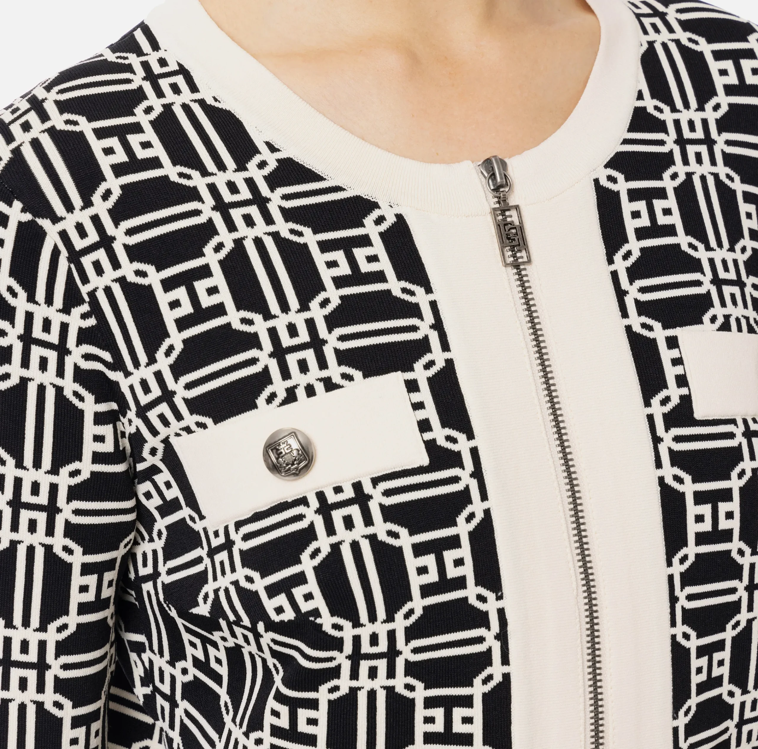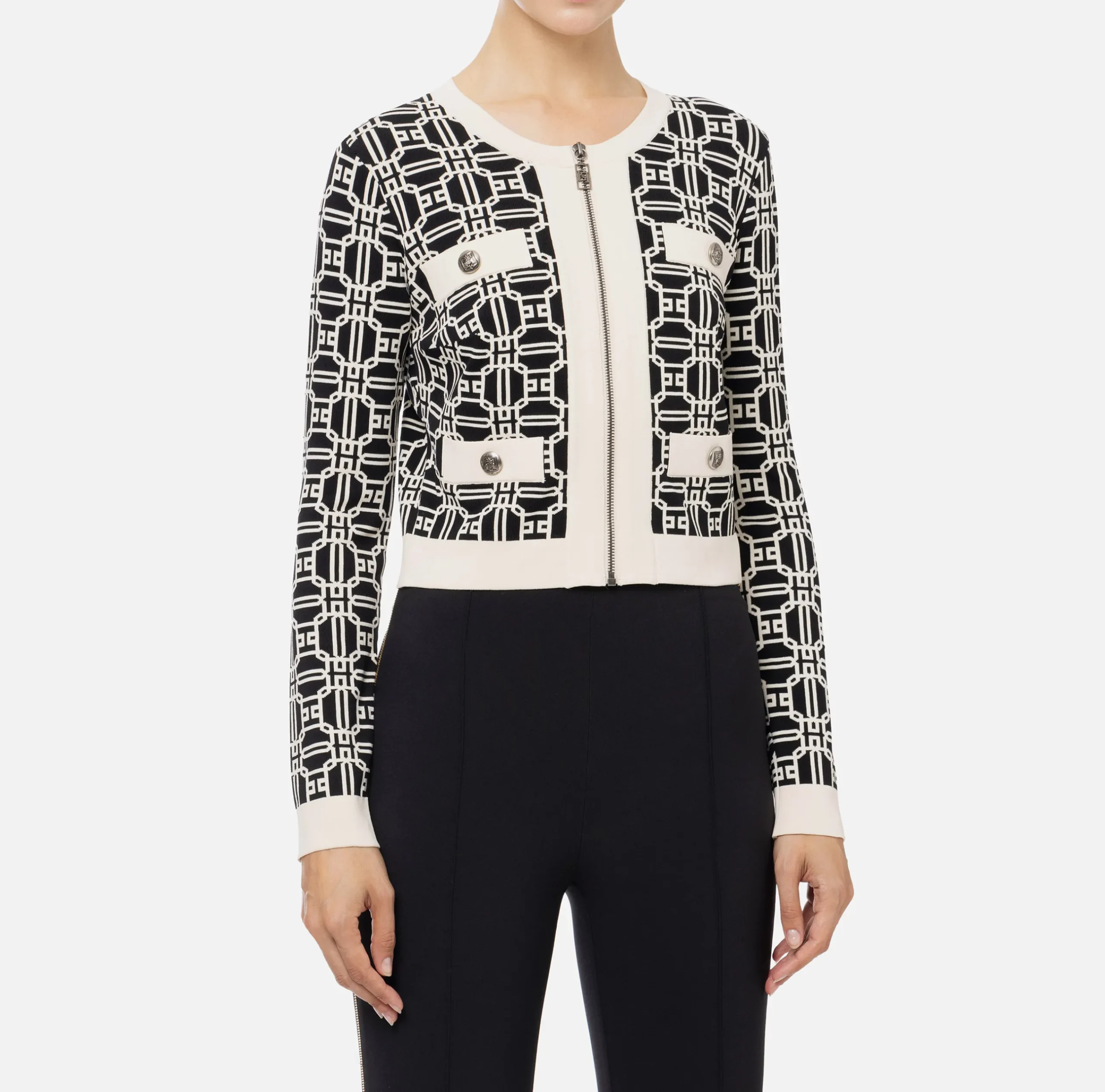 Cardigan cropped in misto viscosa stampa logo jacquard a maniche lunghe con scollo a giro. È caratterizzato da chiusura frontale con zip in metallo dorato con tiretto logo nel centro davanti e finiture in contrasto colore.