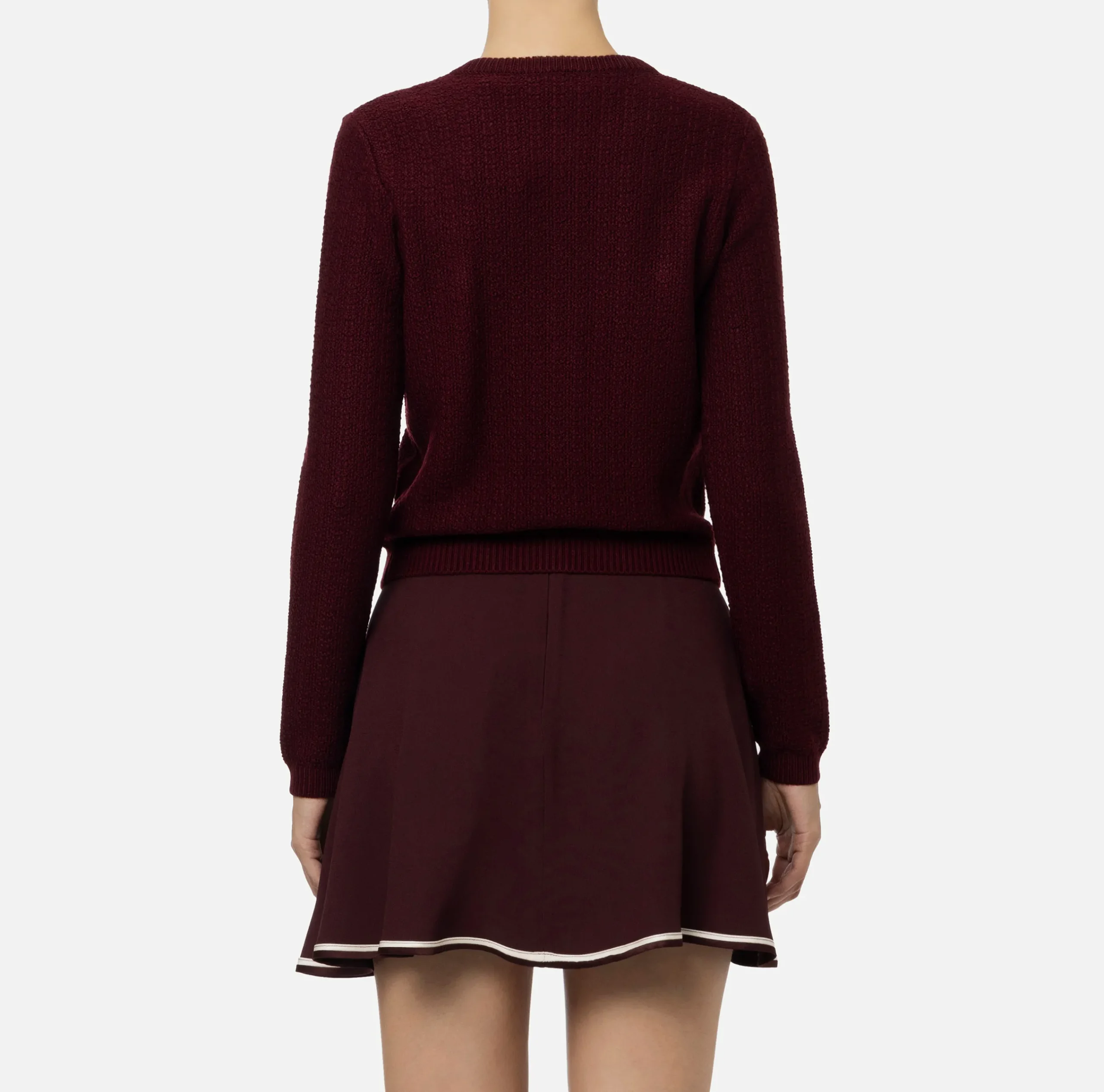 Cardigan in misto lana bouclé a maniche lunghe con scollo a giro. È caratterizzato da tasche a soffietto in vela tecnica rifinite da bottoni logati in metallo silver.