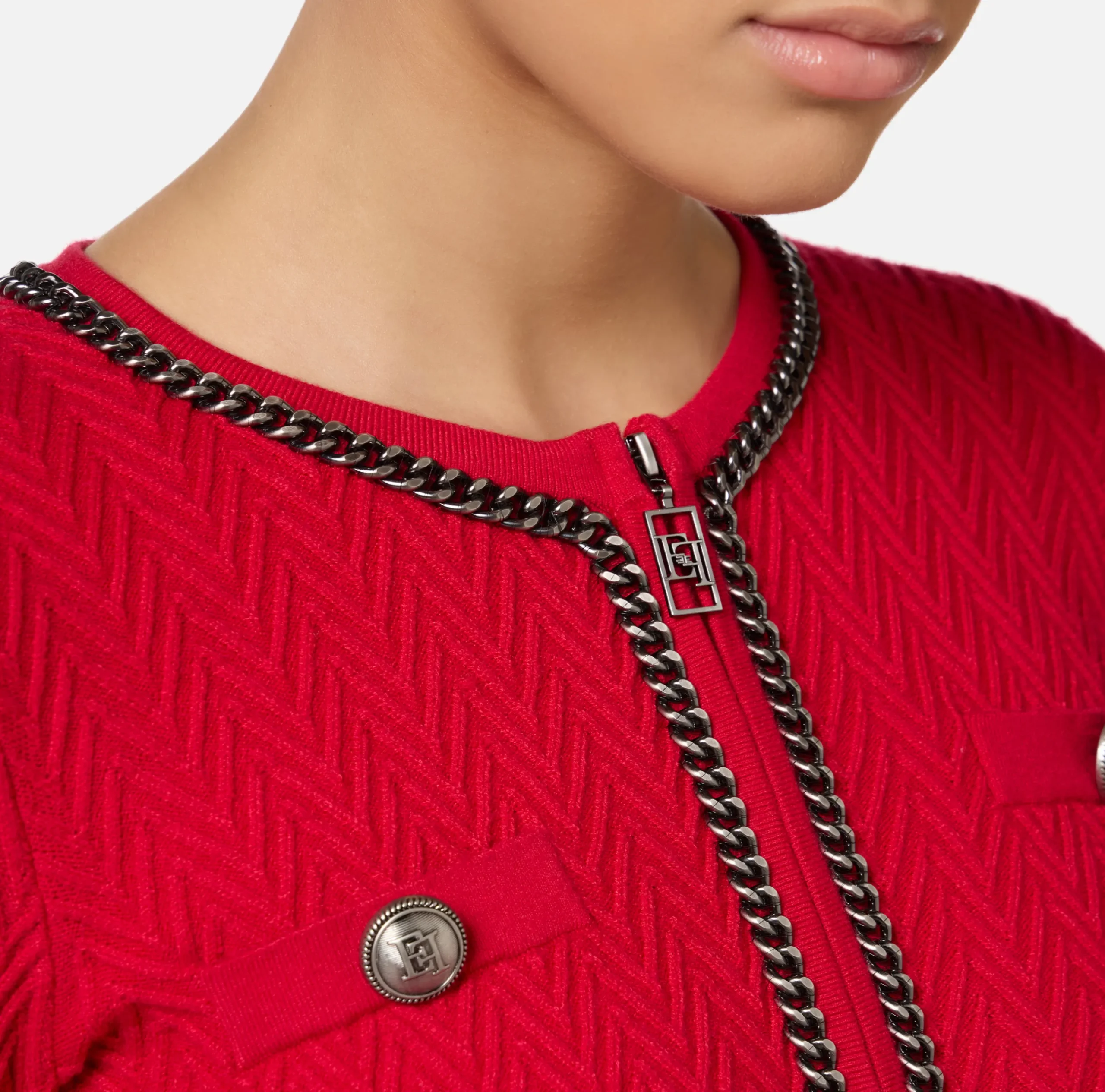 Cardigan in misto viscosa punto resca a maniche lunghe con scollo a giro rifinito da catena in metallo silver. È caratterizzato da filetto con bottone logato e chiusura con zip nel centro davanti.