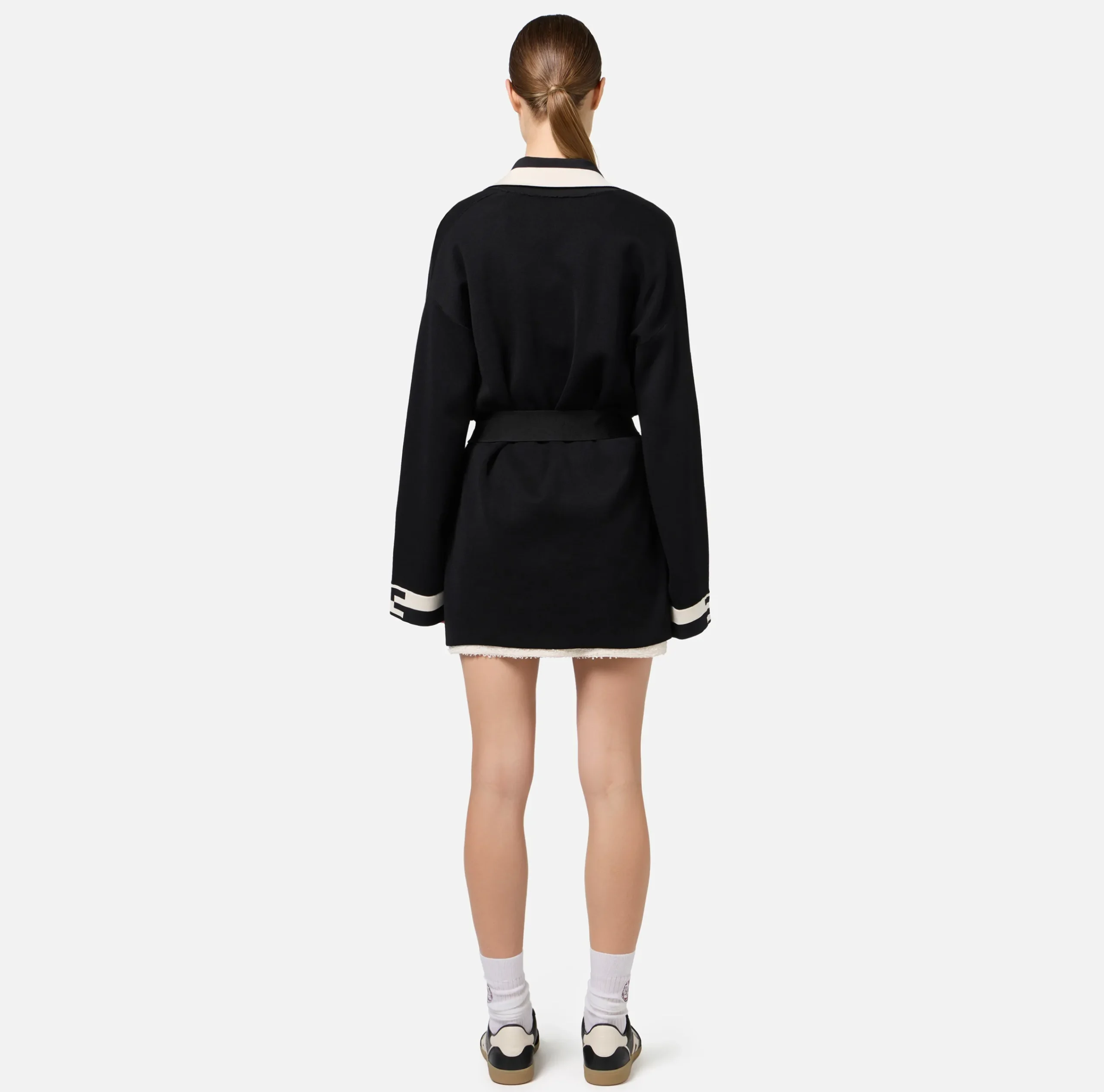 Cardigan in viscosa opaca con collo sciallato, tasche a toppa e cintura in vita. È caratterizzato da bande bicolor con logo in contrasto colore.
