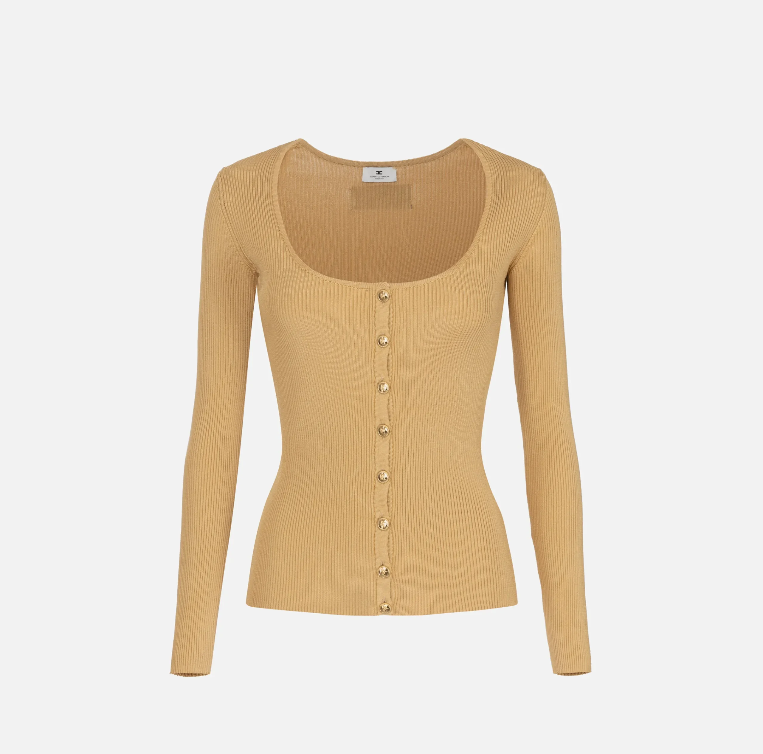 Cardigan in misto viscosa con scollo a madonna e bottoni logati in metallo dorato. Personalizza il capo l’etichetta jacquard logata cucita sul fondo.