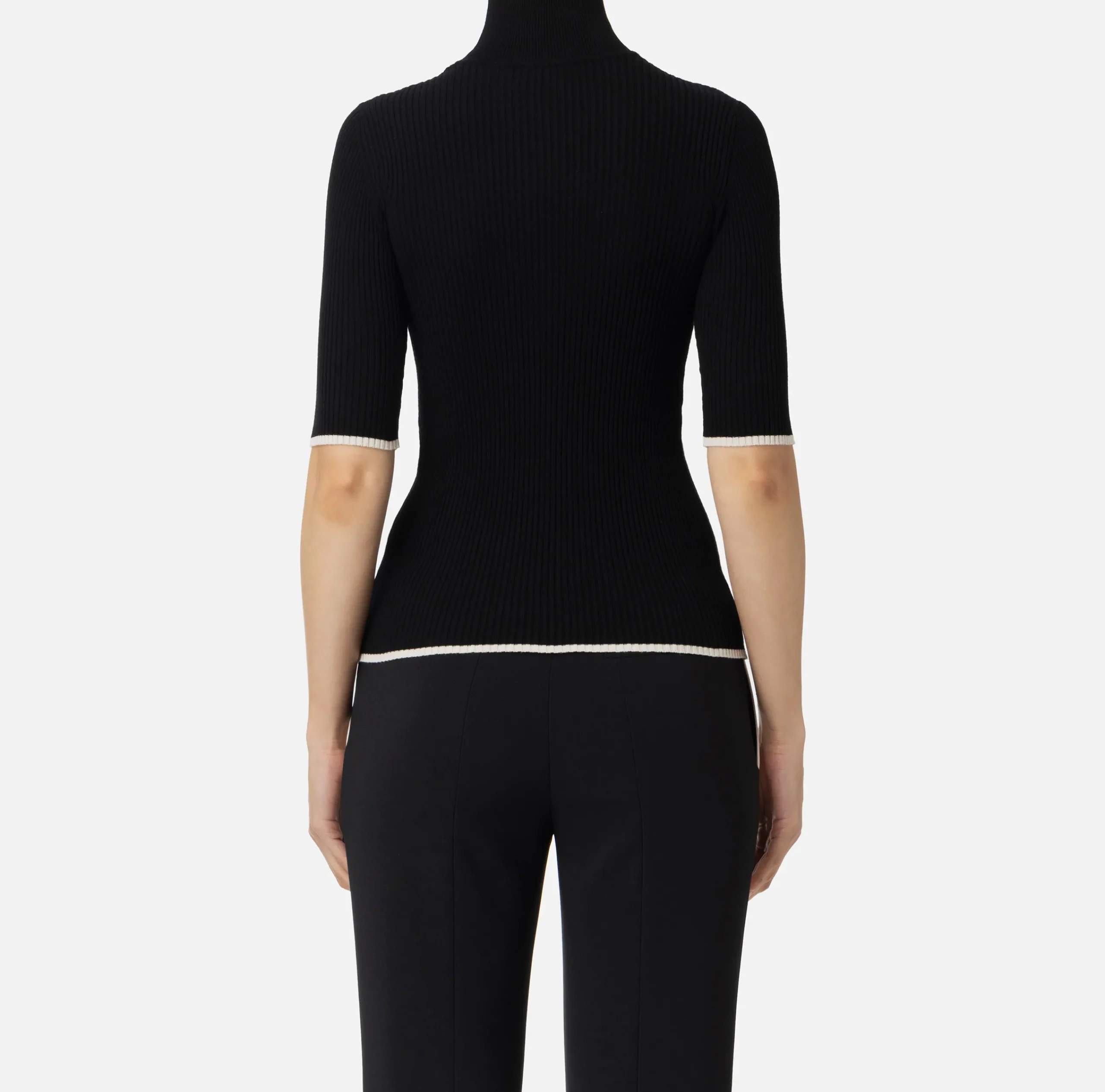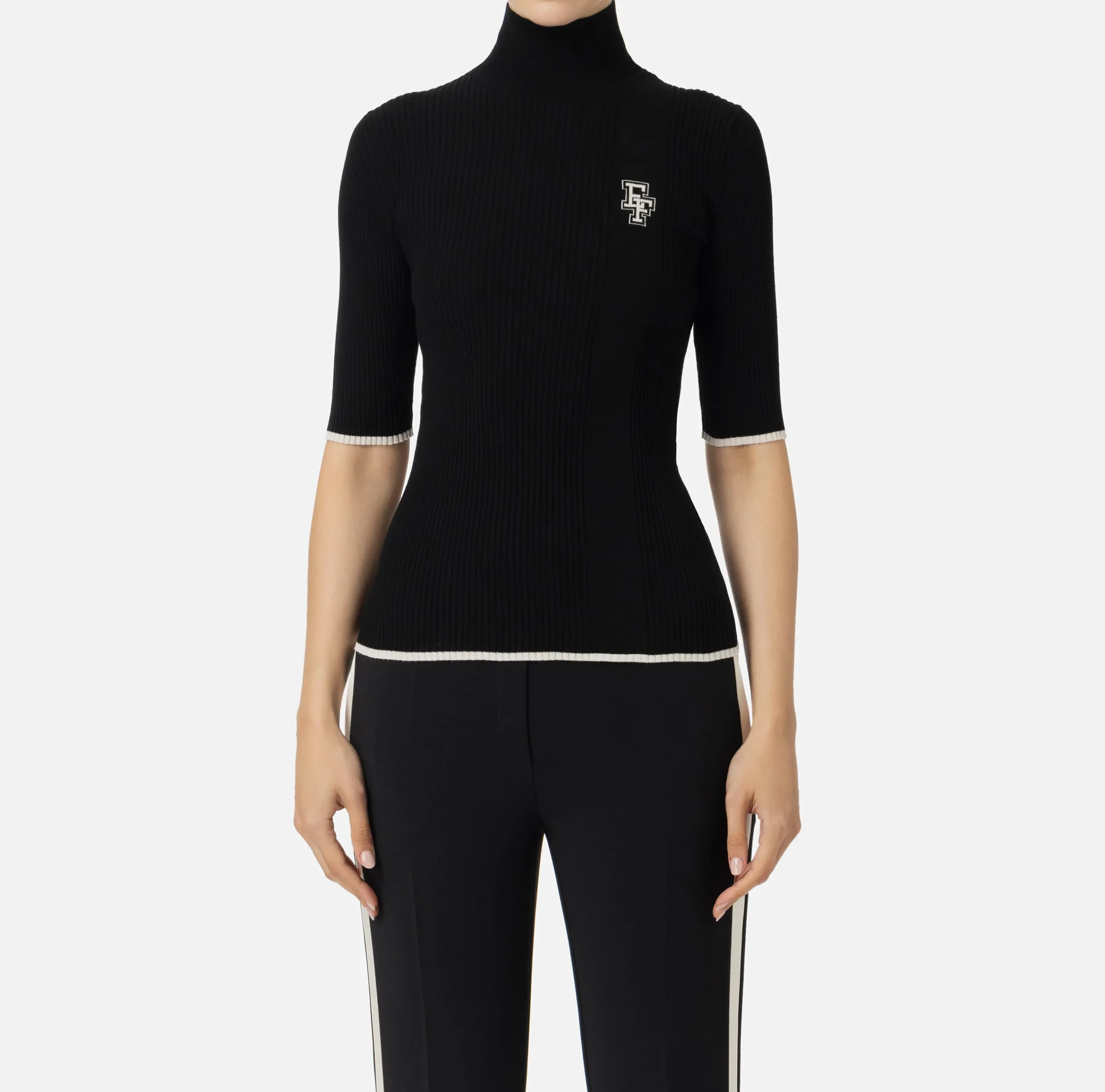 Dolcevita in misto viscosa a costine a maniche corte. È caratterizzata da profili e logo intarsiato in contrasto colore.