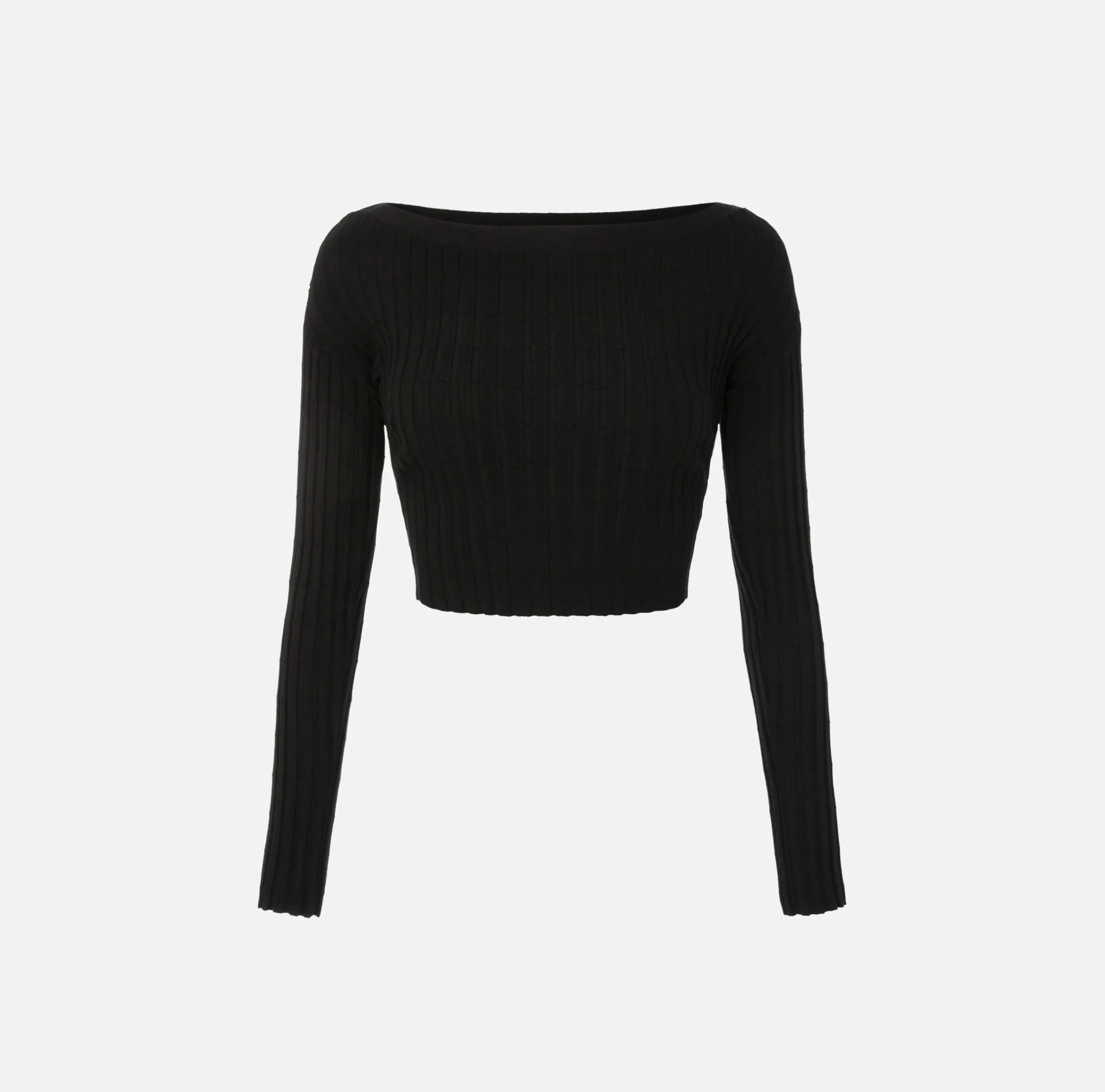 Maglia cropped in viscosa a coste con maniche lunghe. È caratterizzata da scollo a barca rifinito da bottoniera sulle spalle.
