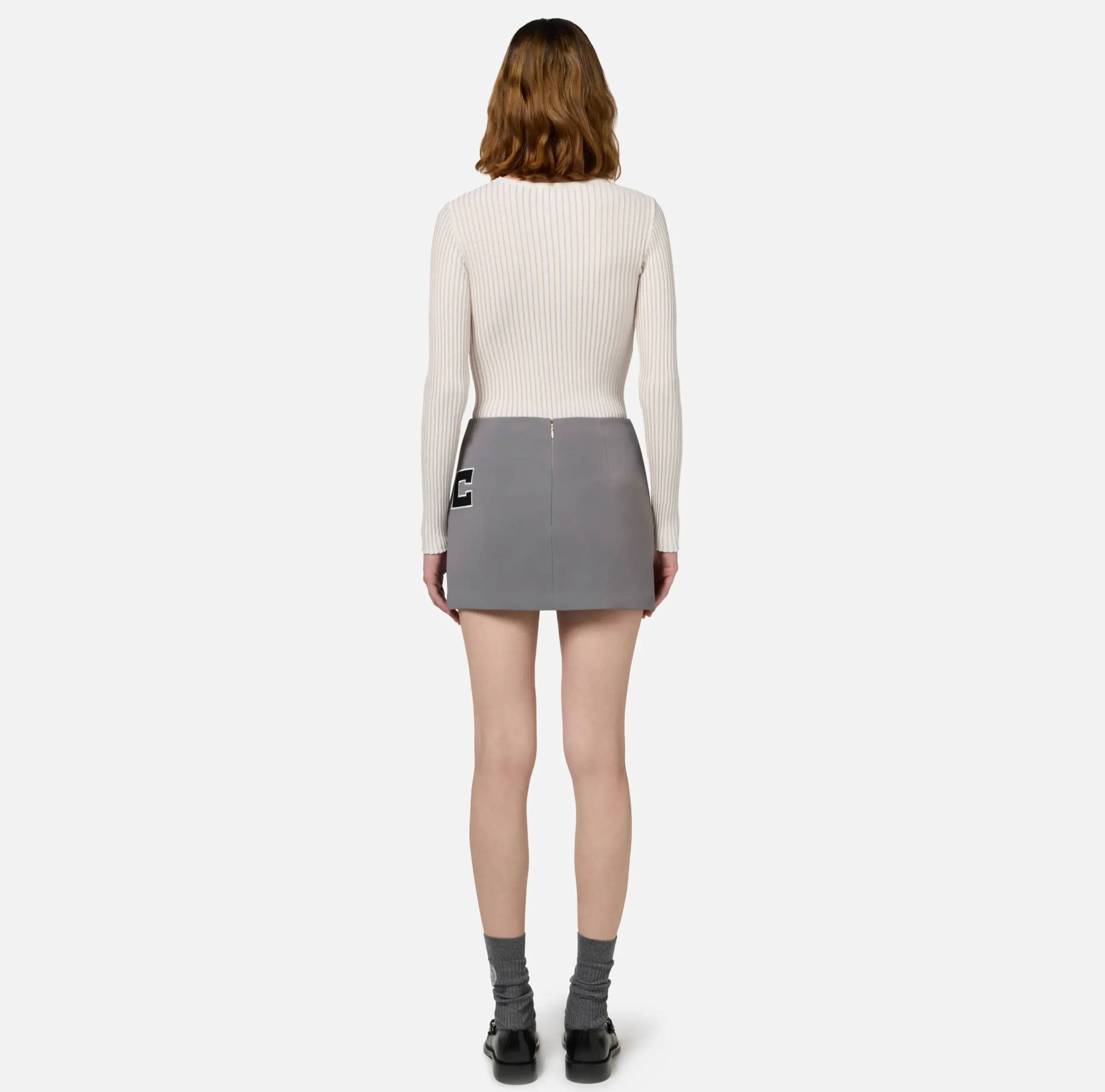 Maglia in viscosa lurex a costine a maniche lunghe. È caratterizzata da placca logo in metallo dorato sullo scollo a giro.