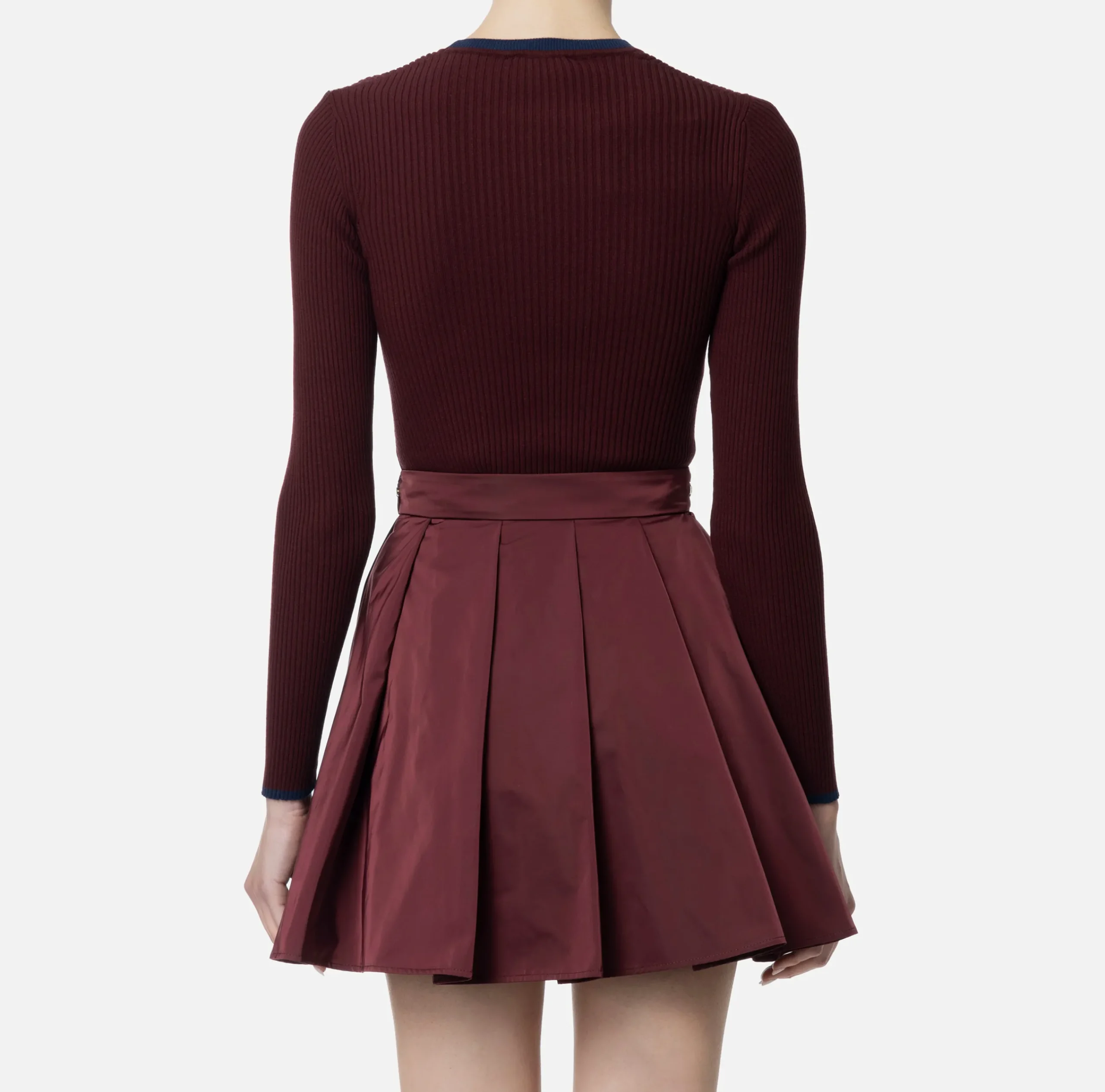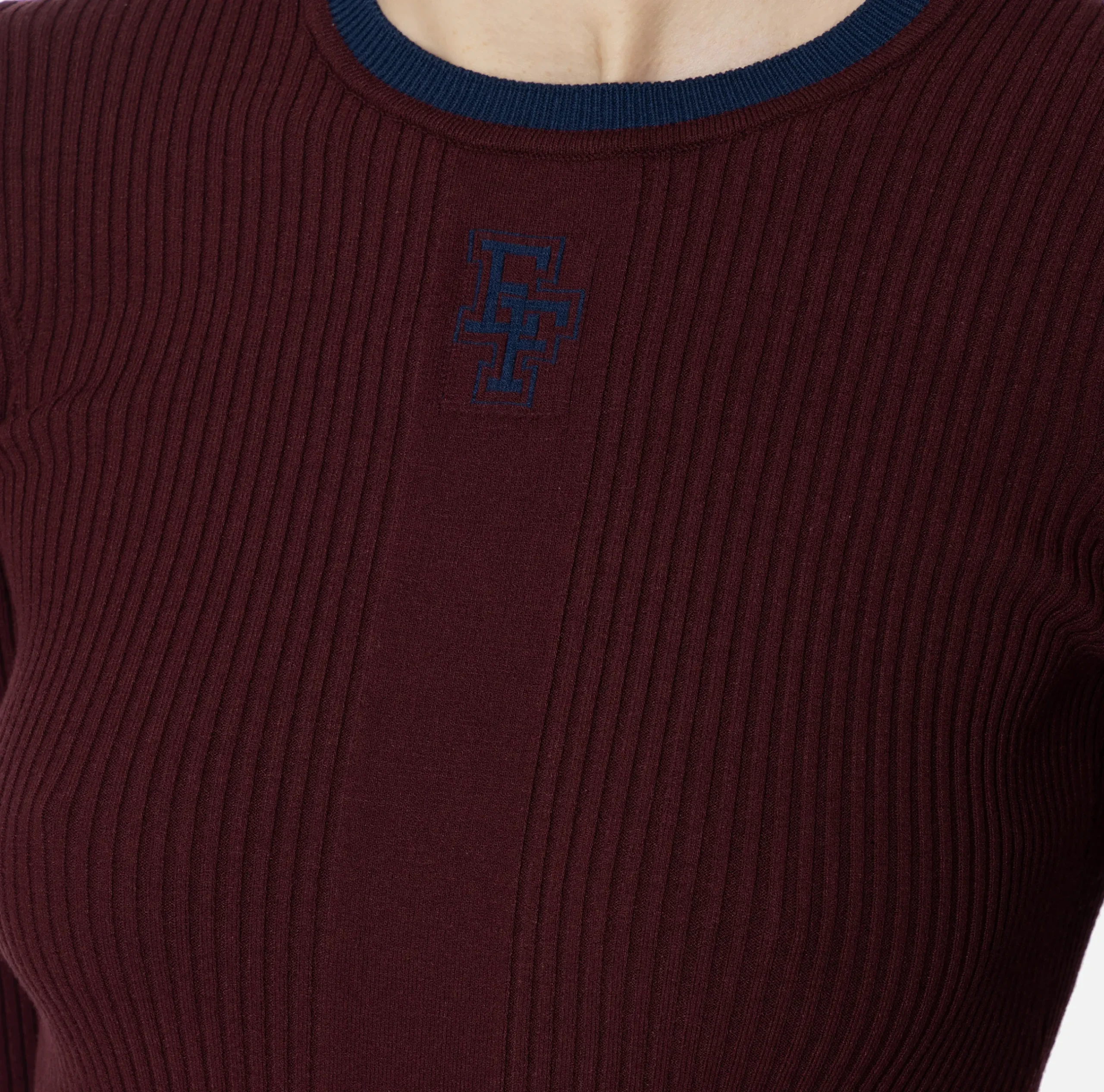 Maglia in misto viscosa a costine a maniche lunghe con scollo a giro. È caratterizzata da profili e logo intarsiato in contrasto colore.
