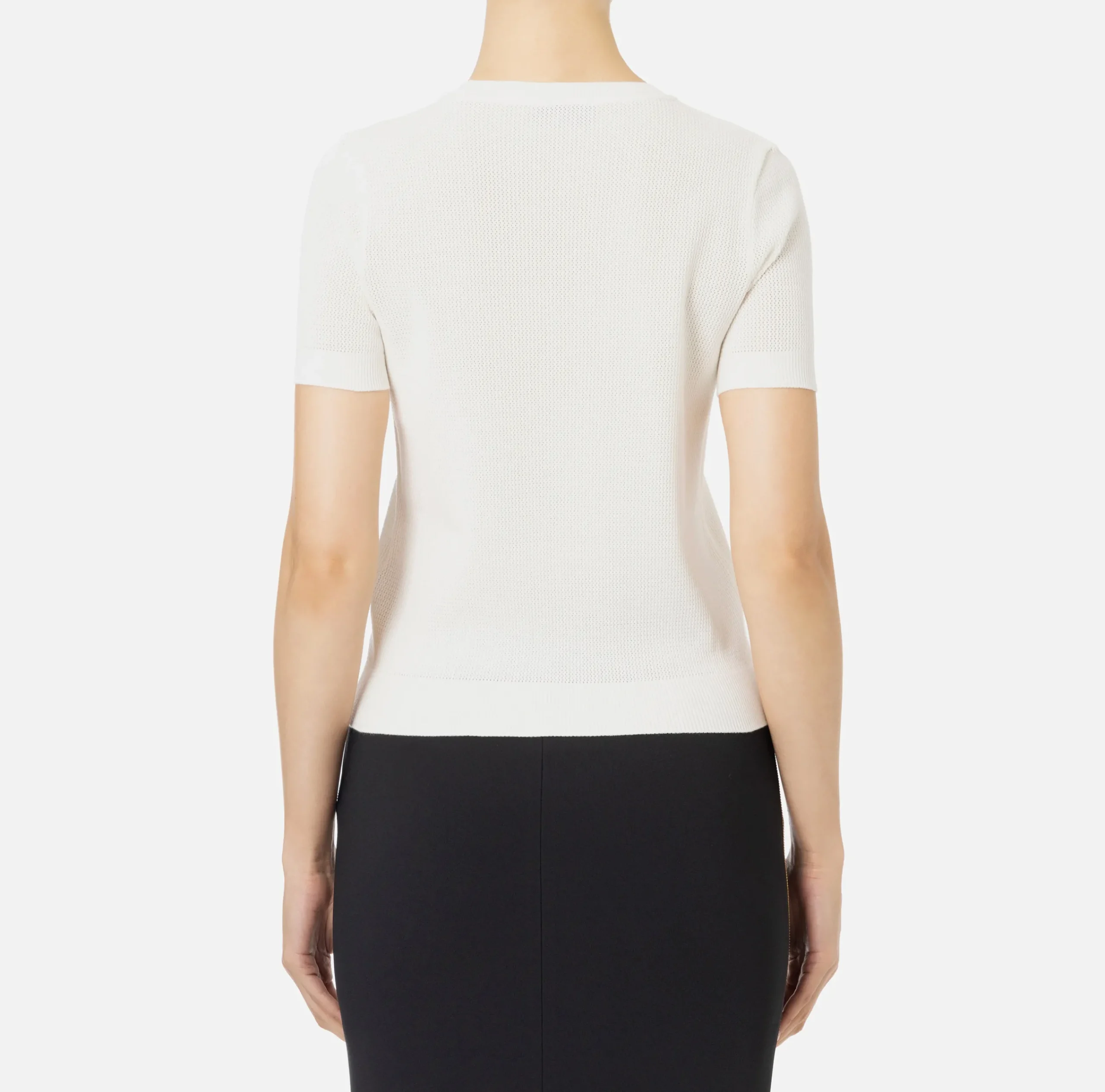 Maglia in viscosa punto rete a maniche corte. È caratterizzato da un intarsio in rasato con logo in contrasto colore.
