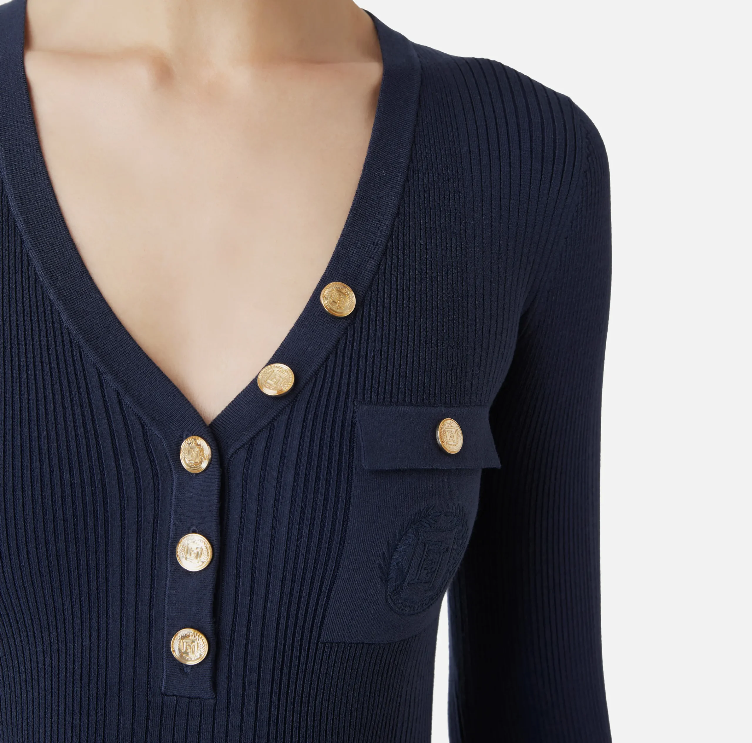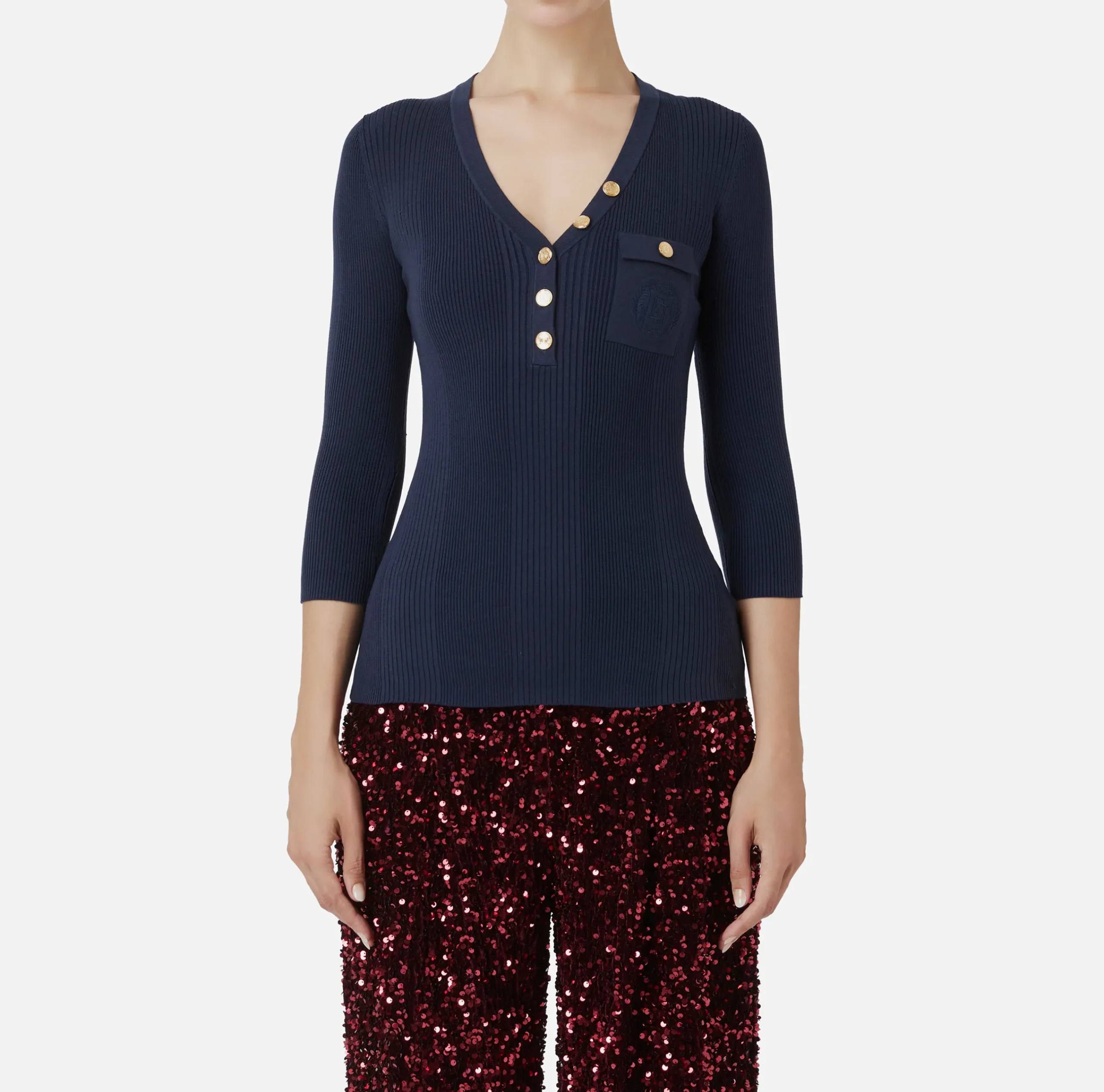 Maglia in lyocell e seta a costine a maniche a 3/4 con scollo a V e tasca con ricamo logo rifinita da bottoni in metallo dorato.