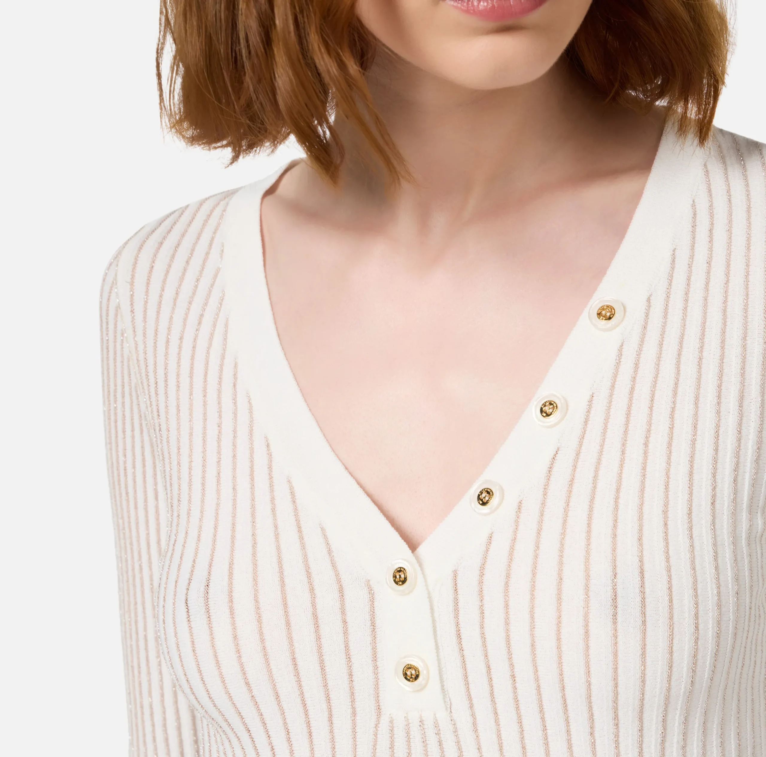 Maglia in viscosa lurex a costine a maniche 3/4 con scollo a V rifinito da bottoni in metallo dorato.