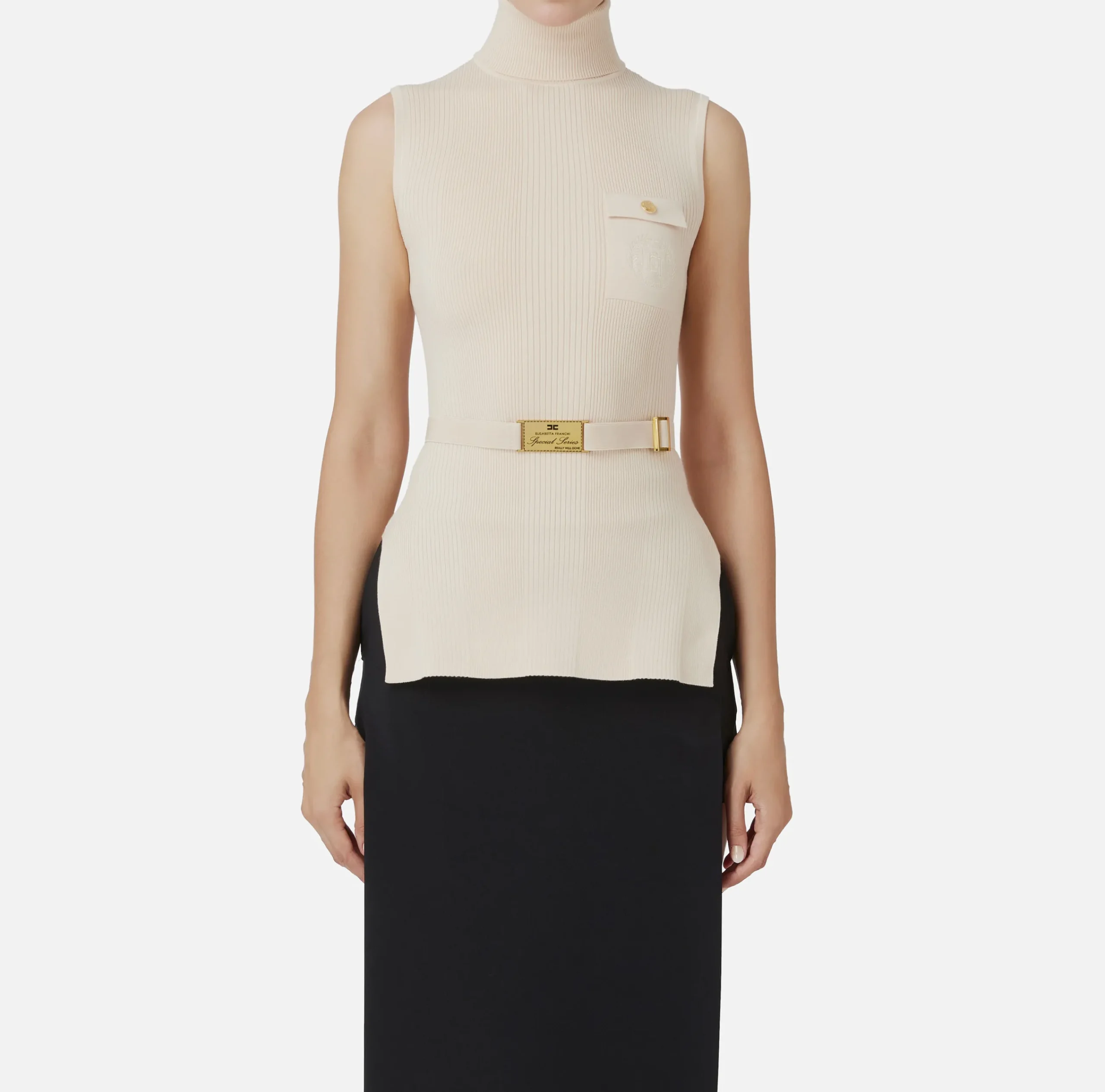Top dolcevita in lyocell e seta a costine con tasca con ricamo logo rifinita da bottoni in metallo dorato. Il punto vita è enfatizzato da una cintura in elastico logato con fibbia in metallo dorato.