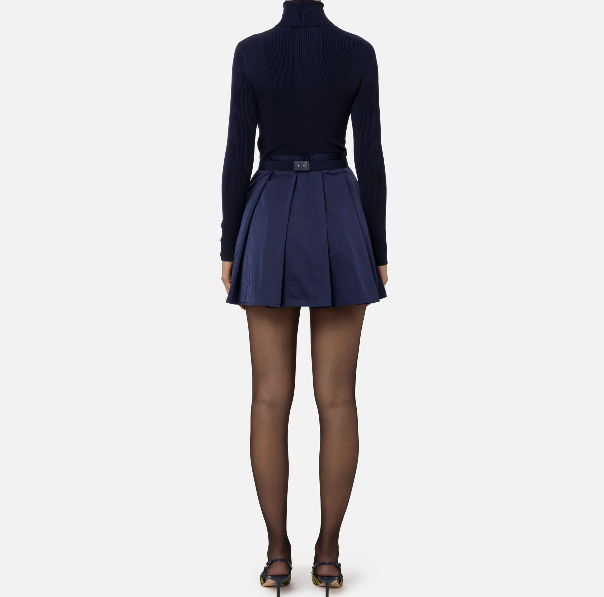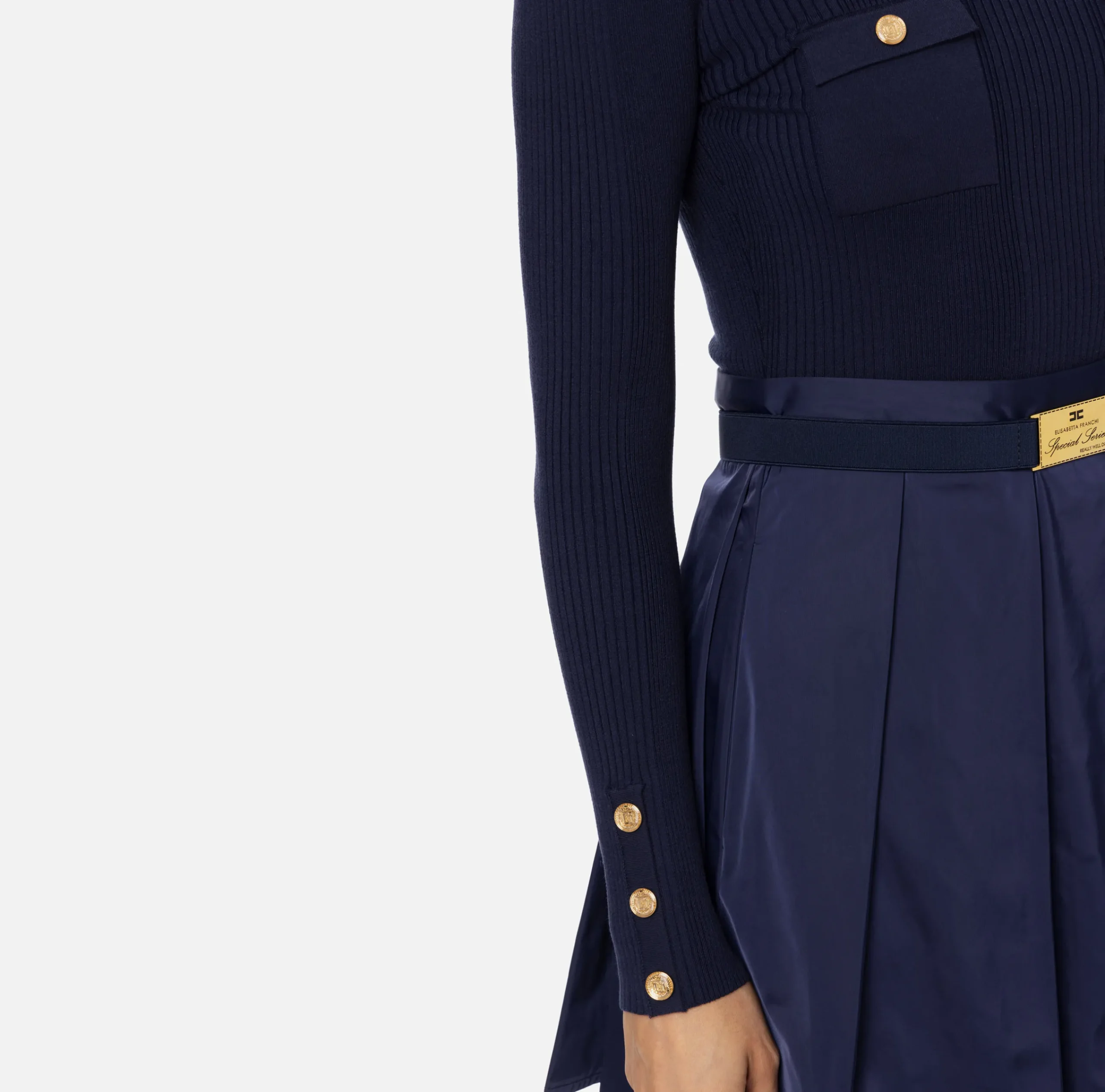 Miniabito in viscosa e seta a costine a maniche lunghe con collo alto e tasche con ricamo logo rifinite da bottoni in metallo dorato. Il punto vita è enfatizzato da una cintura in elastico con fibbia in metallo dorato che sovrasta la gonna a pieghe in nylon.