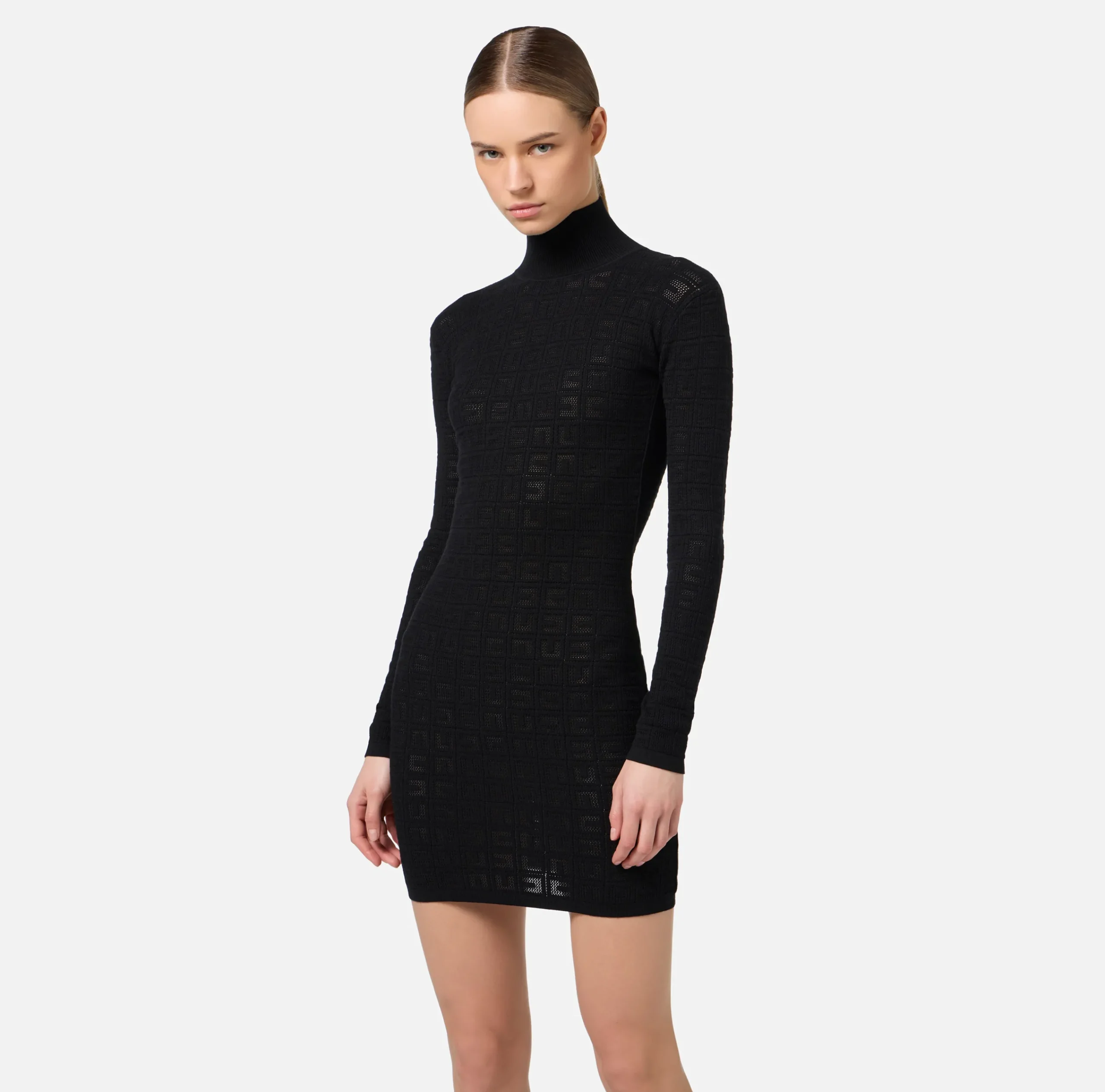 Miniabito in viscosa punto rete con logo all over con profonda scollatura sulla schiena. È caratterizzato da maniche lunghe e collo alto a coste.