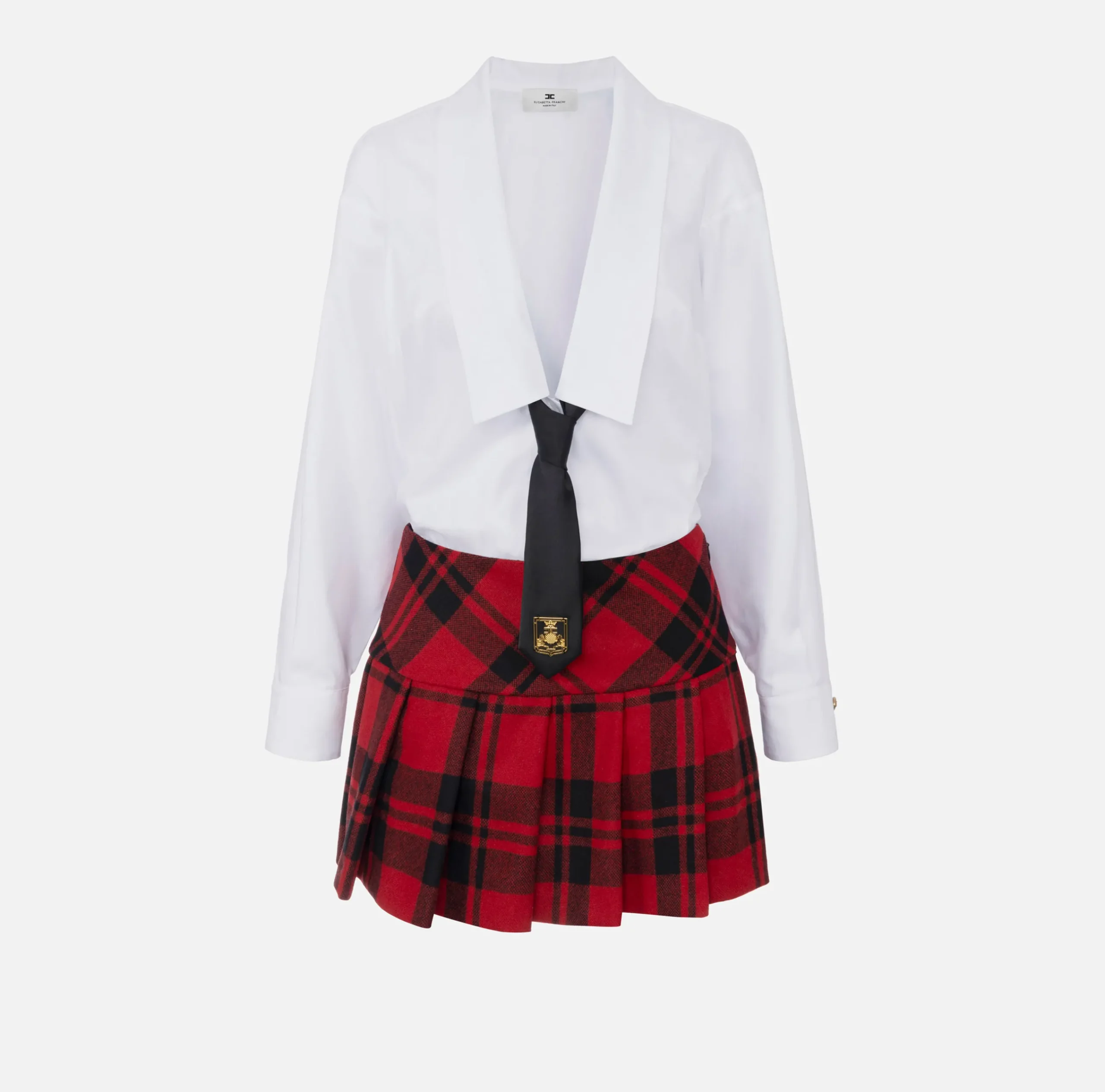 Miniabito composto da camicia staccabile a maniche lunghe e gonna in tartan a pieghe. È caratterizzato da profondo scollo a maxi bavero rifinito da una cravatta removibile in contrasto colore.