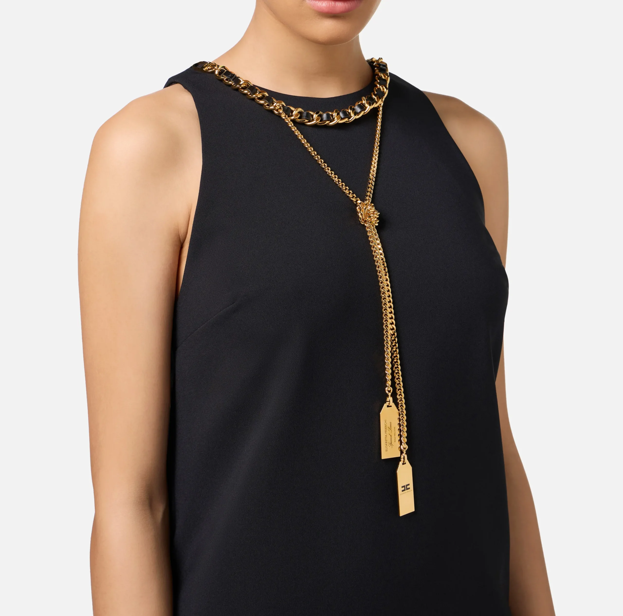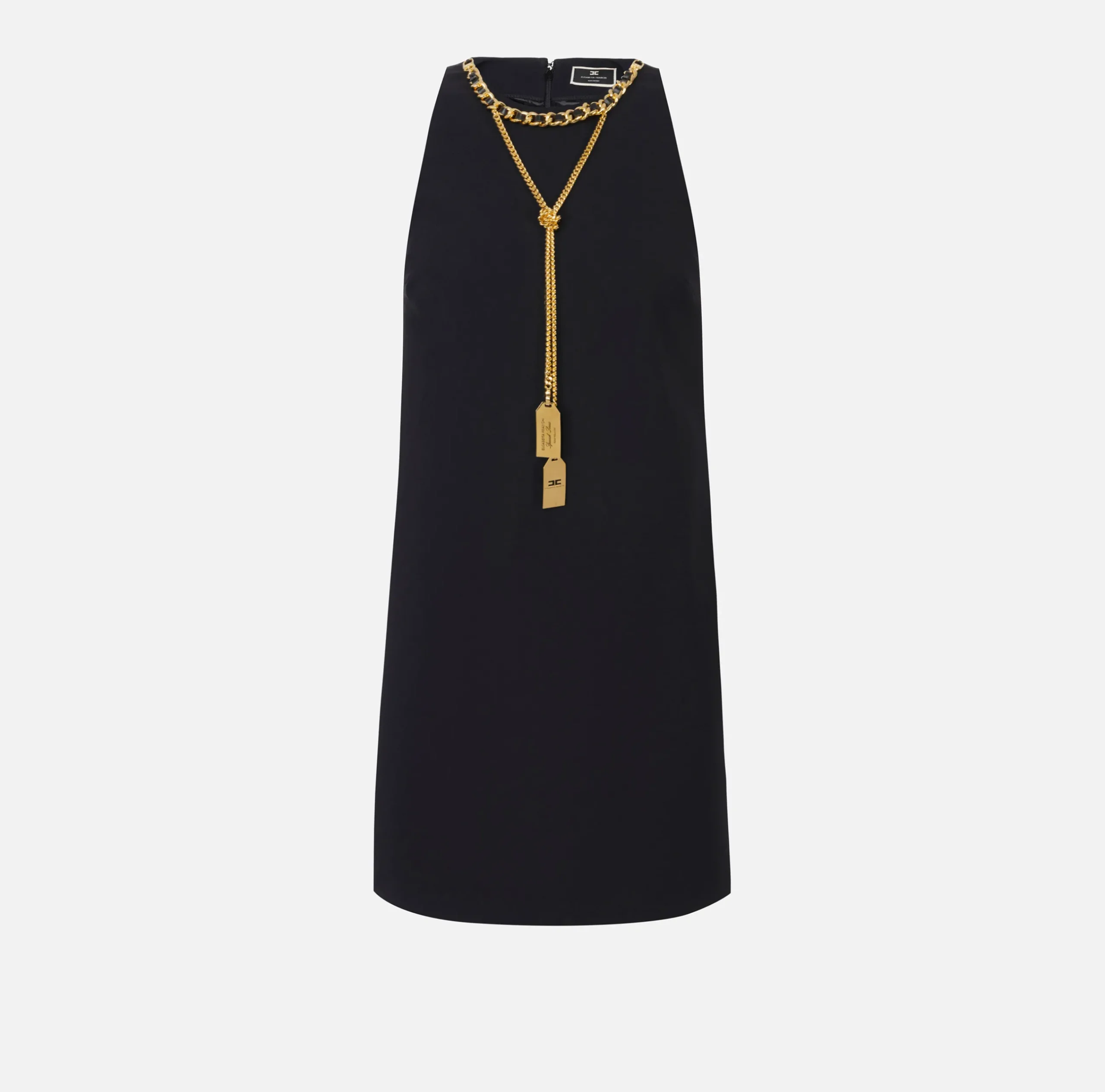 Miniabito smanicato in crêpe stretch dalla linea boxy. È caratterizzato da scollo a giro impreziosito da collana removibile in doppia catena e charms logo in metallo dorato.
