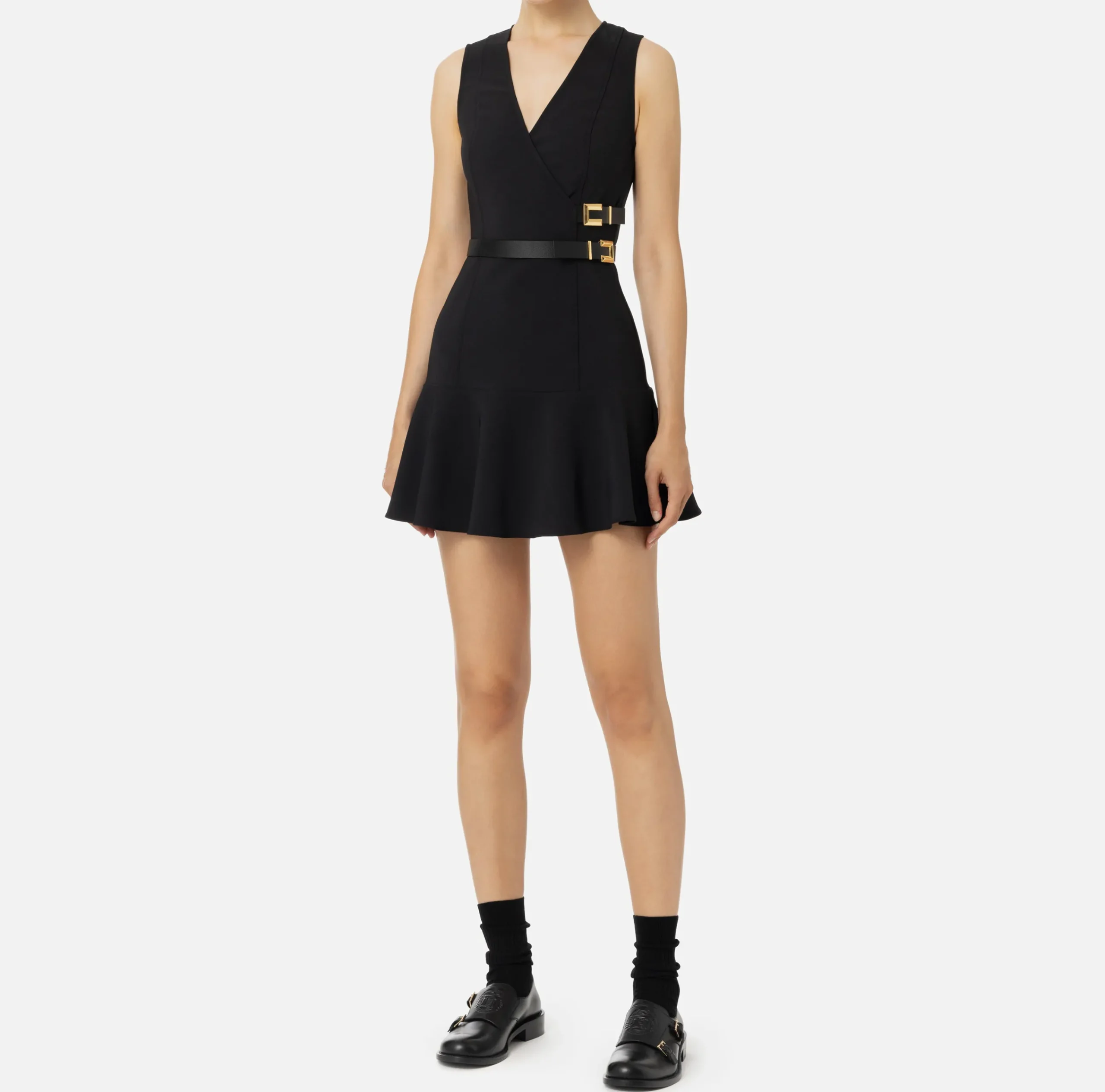 Miniabito in crêpe stretch con scollo incrociato e gonna con balza al fondo. Il punto vita è enfatizzato da motivo di cinturini in materiale sintetico effetto pelle con placca logo in metallo dorato.