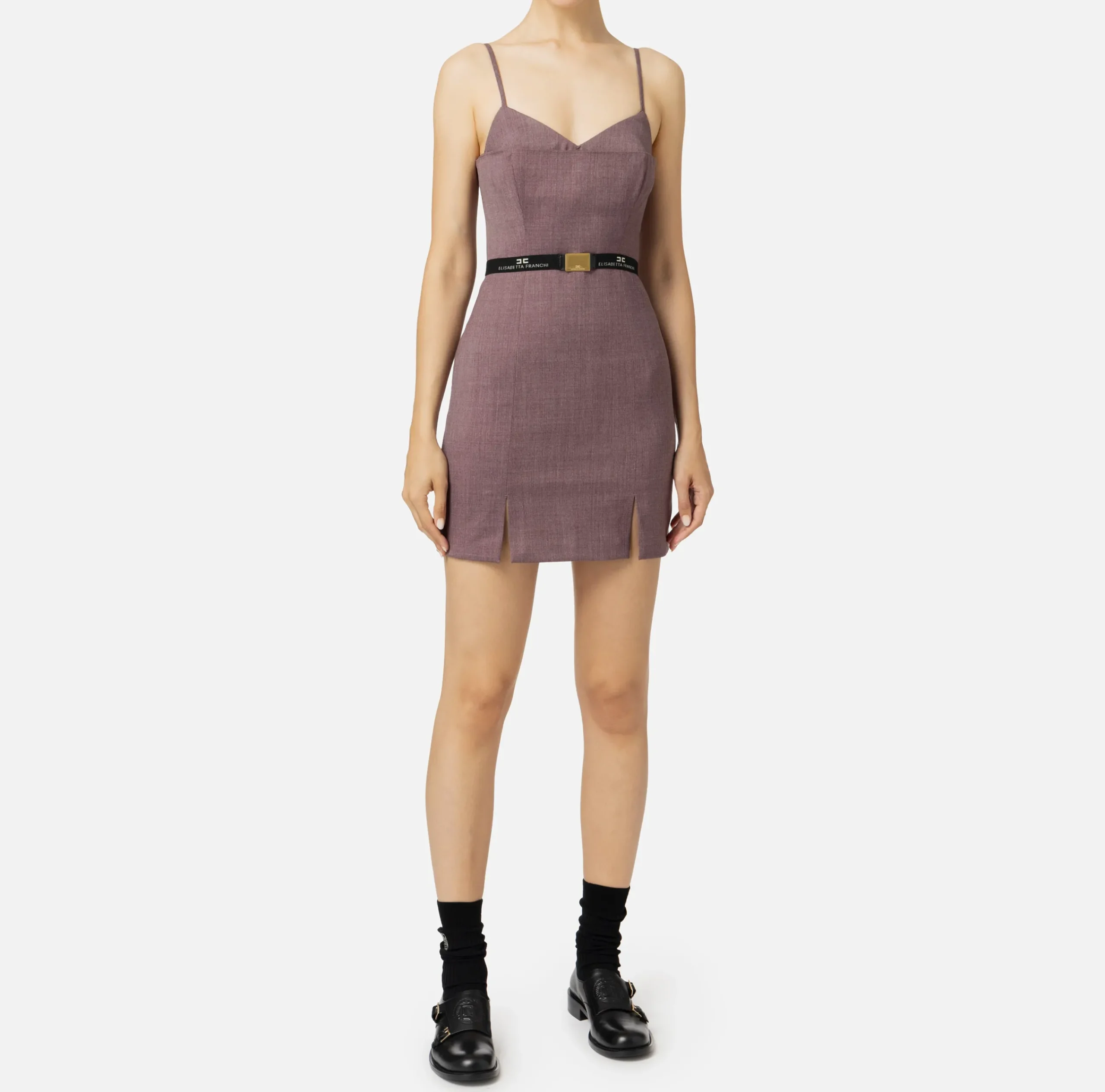 Miniabito in fresco lana mélange con motivo di doppio scollo e spacchi laterali sul davanti. Il punto vita è enfatizzato da una cintura in elastico logato con fibbia a scatto in metallo dorato.