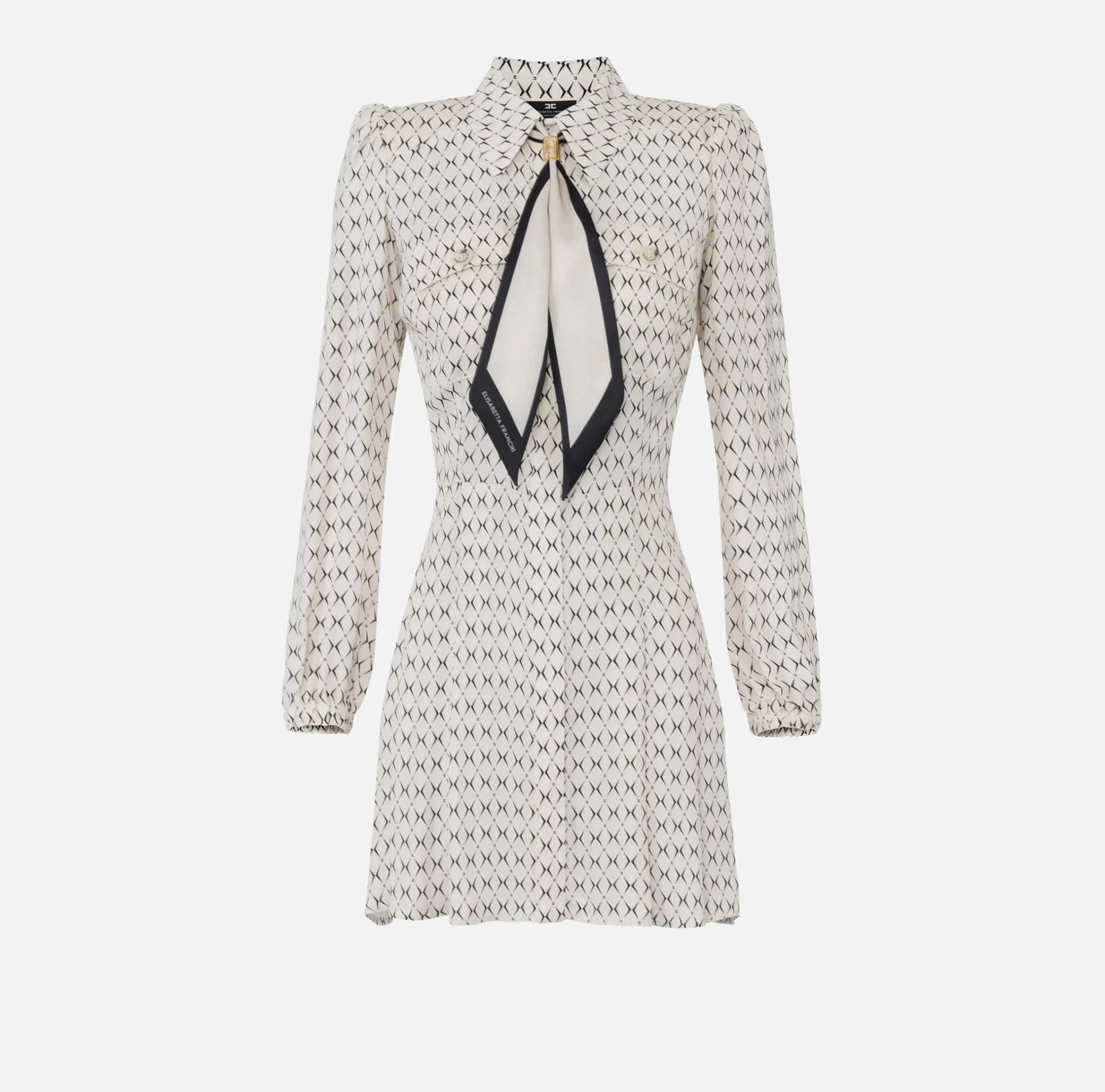 Mini Abiti|Abiti|Elisabetta Franchi Miniabito in georgette stampa rombo con foulard Burro/Nero
