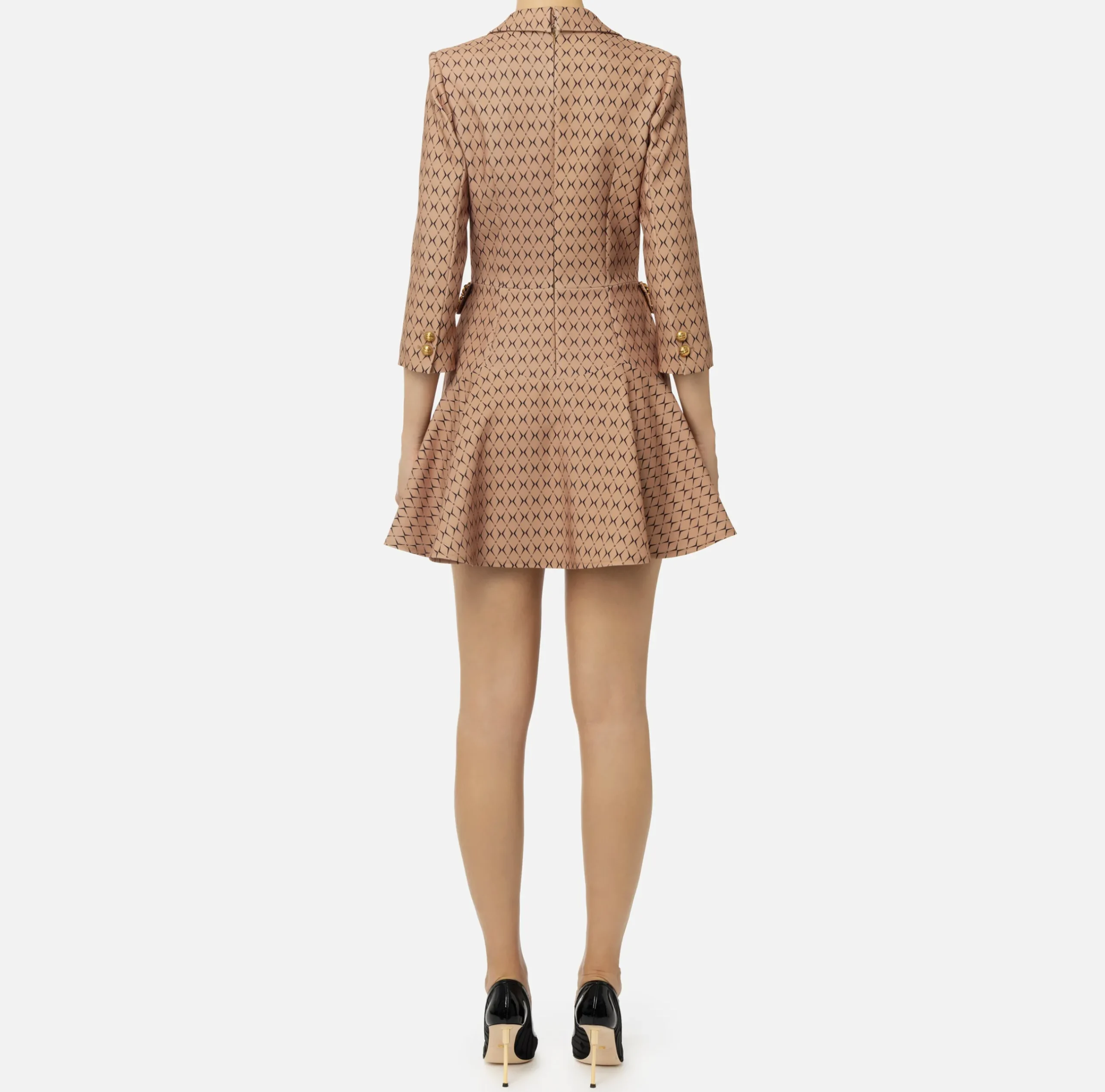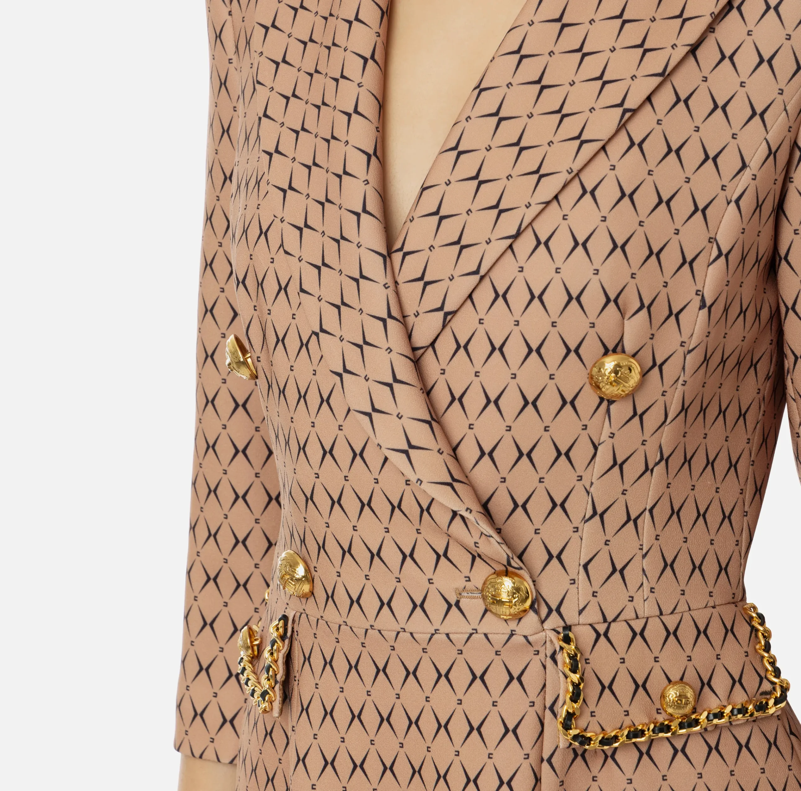 Mini Abiti|Robes Manteaux|Elisabetta Franchi Robe manteau in crêpe stretch stampa rombo con catena Camel/Nero