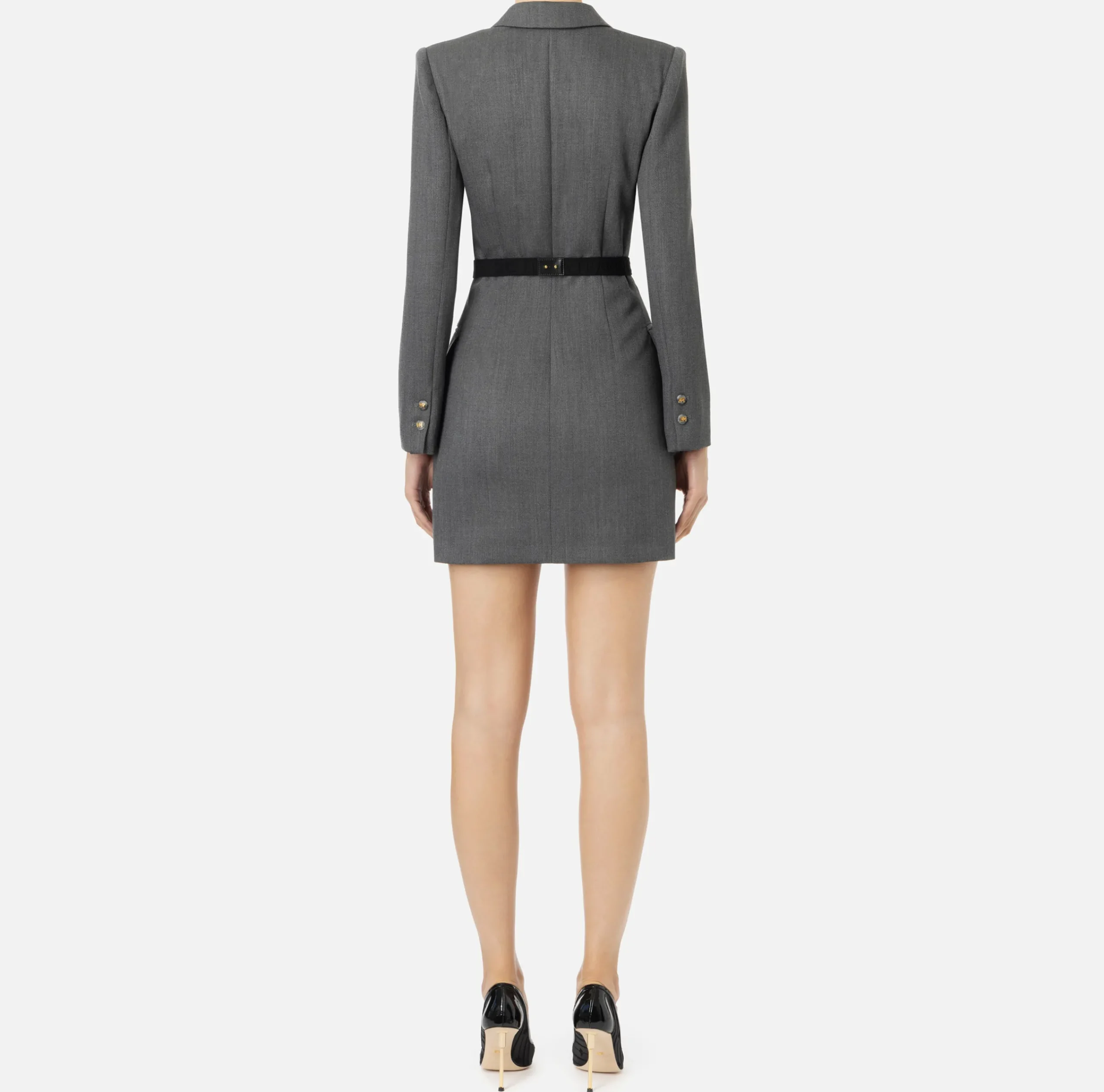 Robe-manteau in fresco lana stretch con spalle strutturate e chiusura monopetto con bottoni logati effetto corno. Il punto vita è enfatizzato da una cintura in elastico logato con fibbia in metallo dorato.