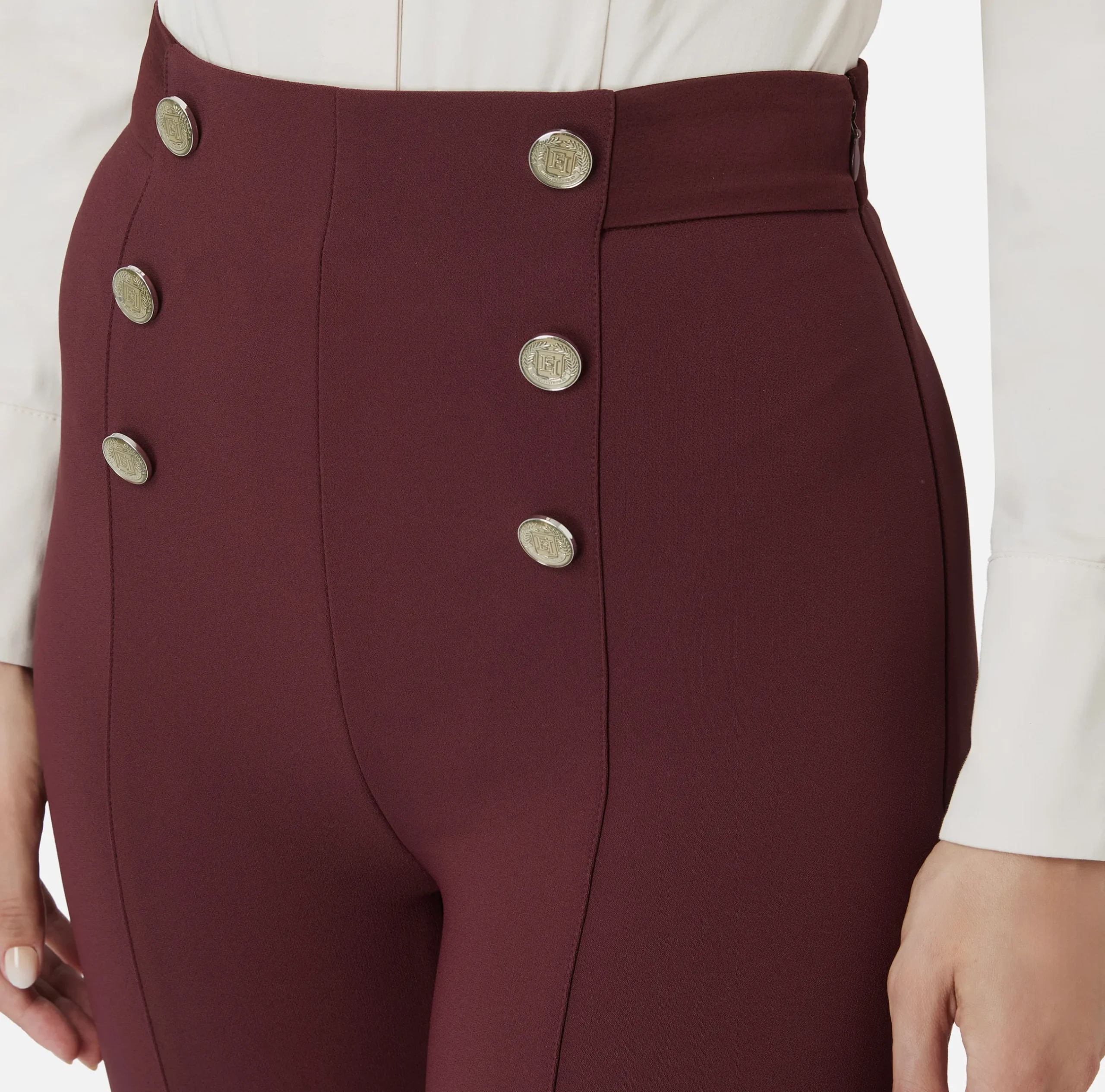 Pantalone a zampa vita alta in crêpe stretch con fascione in raso. È caratterizzato da bottoniera sul bacino.
