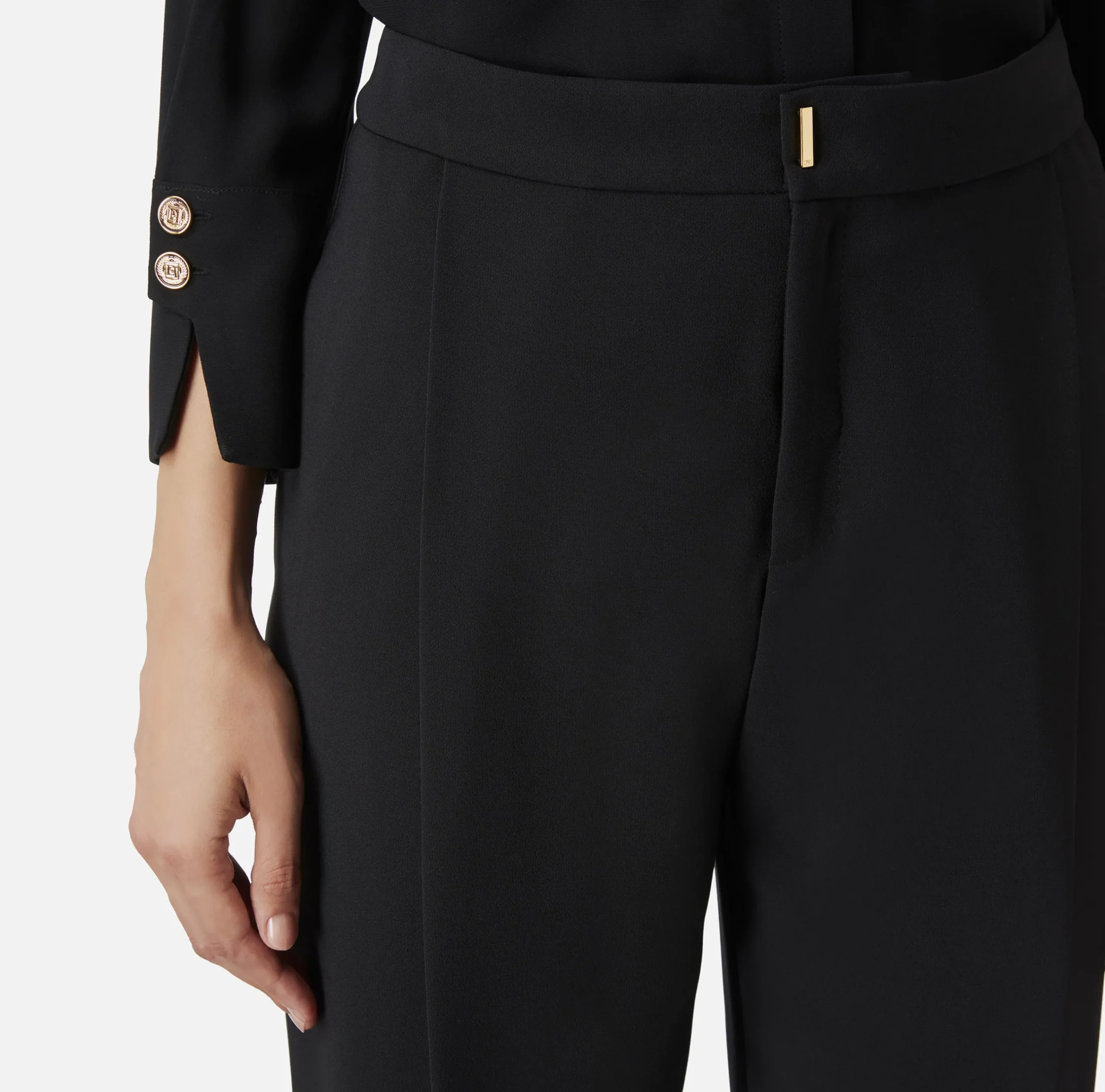 Pantalone dritto cropped in crêpe con pinces e stiro piega sul davanti. Il punto vita è enfatizzato da un fascione con placca verticale in metallo dorato.