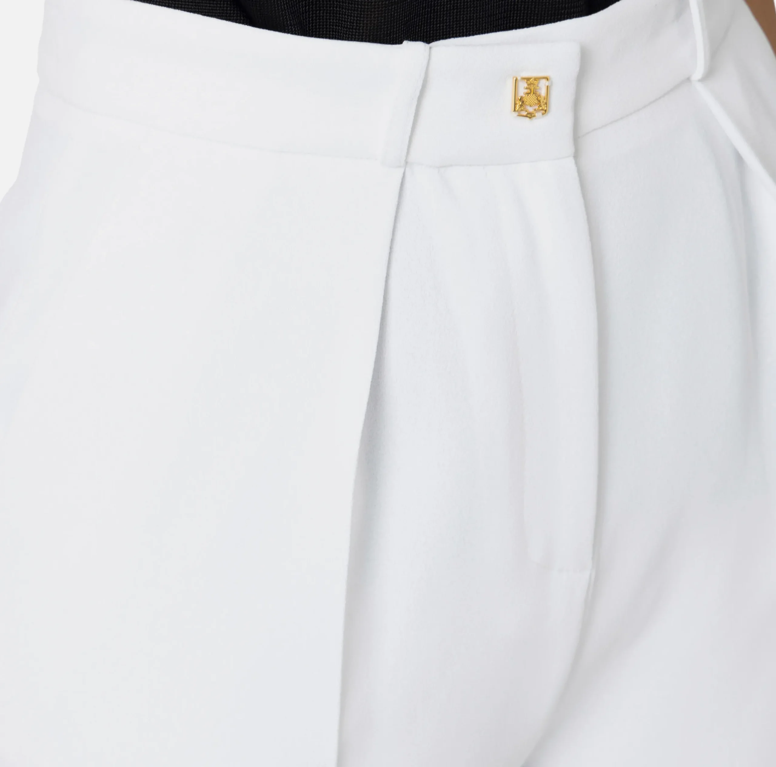 Pantalone dritto in crêpe fermo con pinces, tasche alla francese e tasche posteriori con patte. È caratterizzato da fascione con rivetto logo in metallo dorato.