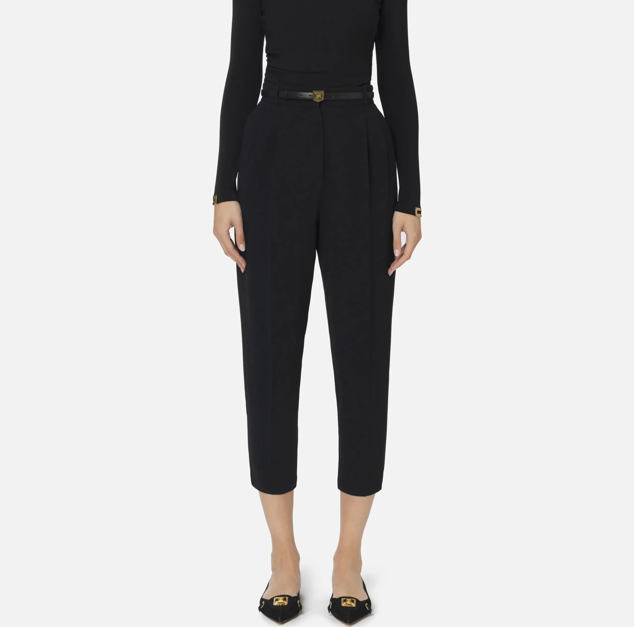 Pantalone dritto alla caviglia in crêpe fermo con doppia pinces e tasche a patta sul dietro con ricamo logo a filo in tono. Il punto vita è enfatizzato da cintura con fibbia logo in metallo dorato.